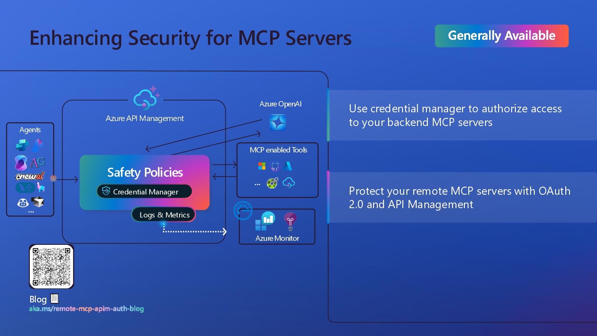access to your backend MCP servers Protect your remote MCP servers with OAuth 2.0 and API Management Blog aka.ms/remote-mcp-apim-auth-blog Generally Available Azure API Management Safety Policies Azure OpenAI MCP enabled Tools Azure Monitor Logs & Metrics … Credential Manager Agents …