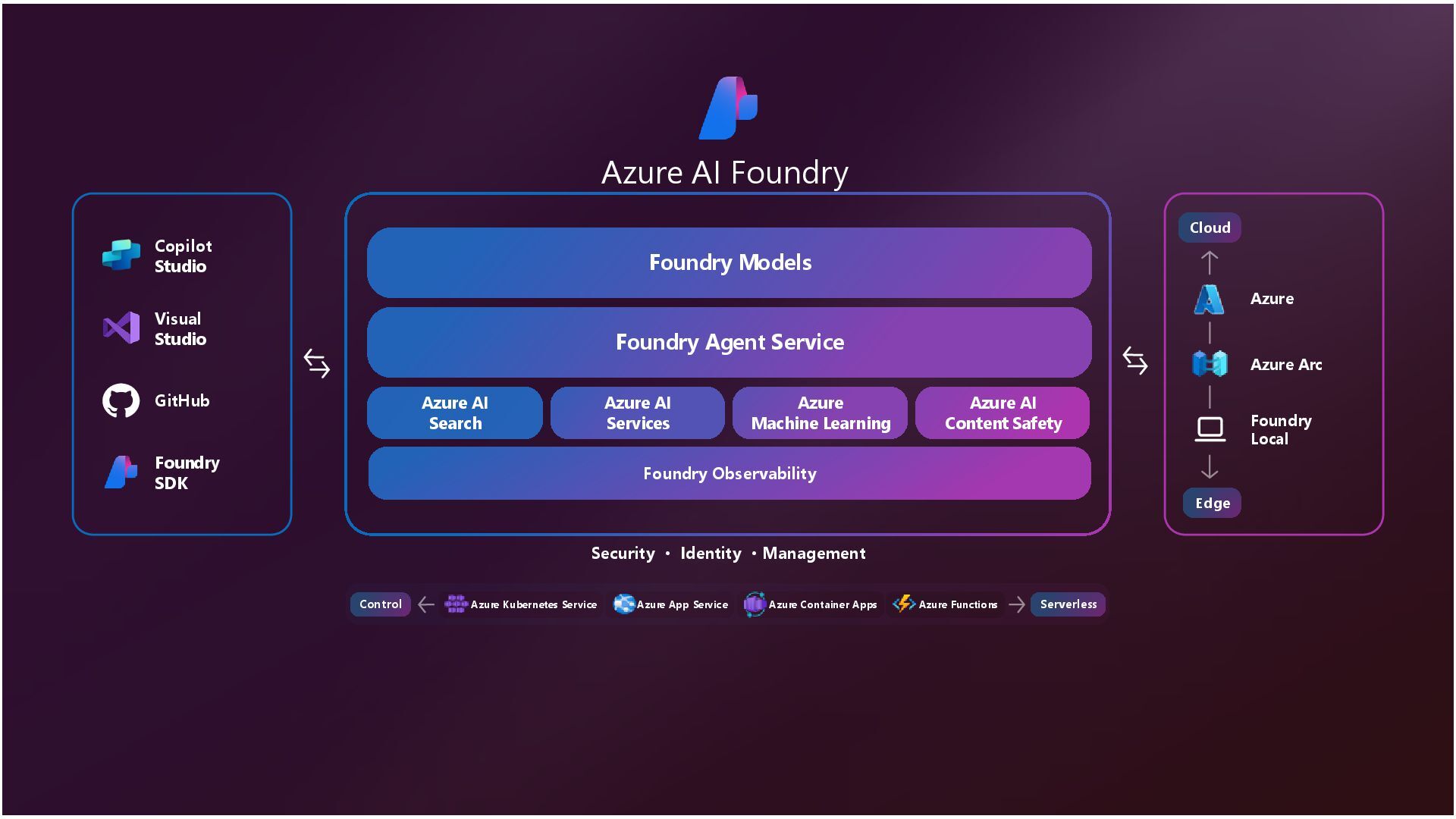 Foundry Agent Service Azure AI Search Foundry Observability Azure AI Services Azure Machine Learning Azure AI Content Safety Copilot Studio Visual Studio GitHub Foundry SDK Serverless Control Azure Kubernetes Service Azure Container Apps Azure App Service Azure Functions Cloud Azure Azure Arc Foundry Local Edge