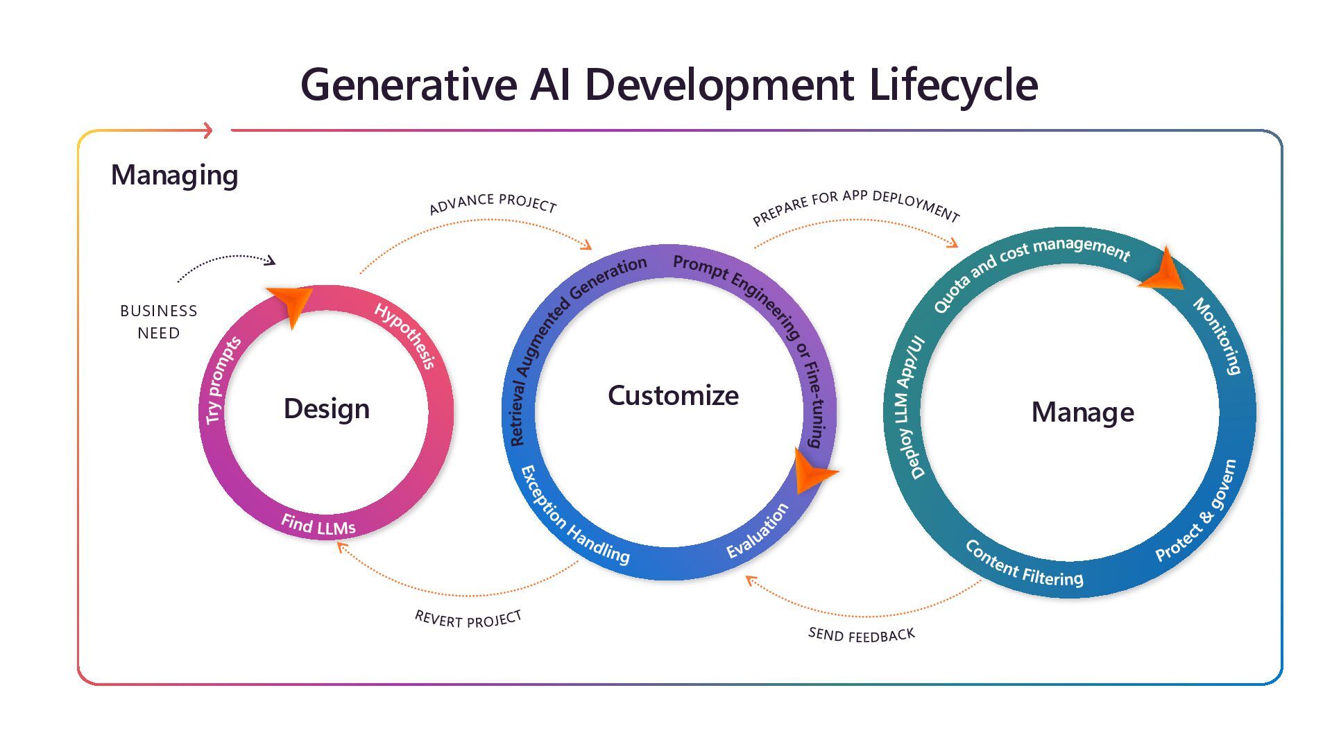 Manage Customize Design Managing PREPARE FOR APP DEPLOYMENT ADVANCE PROJECT BUSINESS NEED Deploy LLM App/UI Quo ta and cost management REVERT PROJECT C ontent Filtering M onitoring SEND FEEDBACK Prompt Engine ering or Fine-tuning Evalua tion Exceptio n Handling Retrieval Augmente d Generation Prote ct & govern