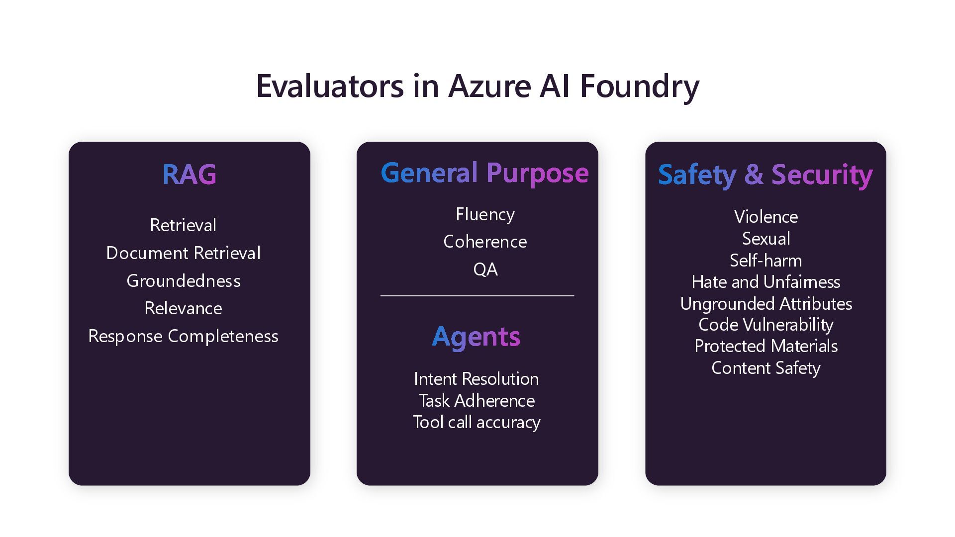 Relevance Response Completeness General Purpose Fluency Coherence QA Safety & Security Violence Sexual Self-harm Hate and Unfairness Ungrounded Attributes Code Vulnerability Protected Materials Content Safety Agents Intent Resolution Task Adherence Tool call accuracy