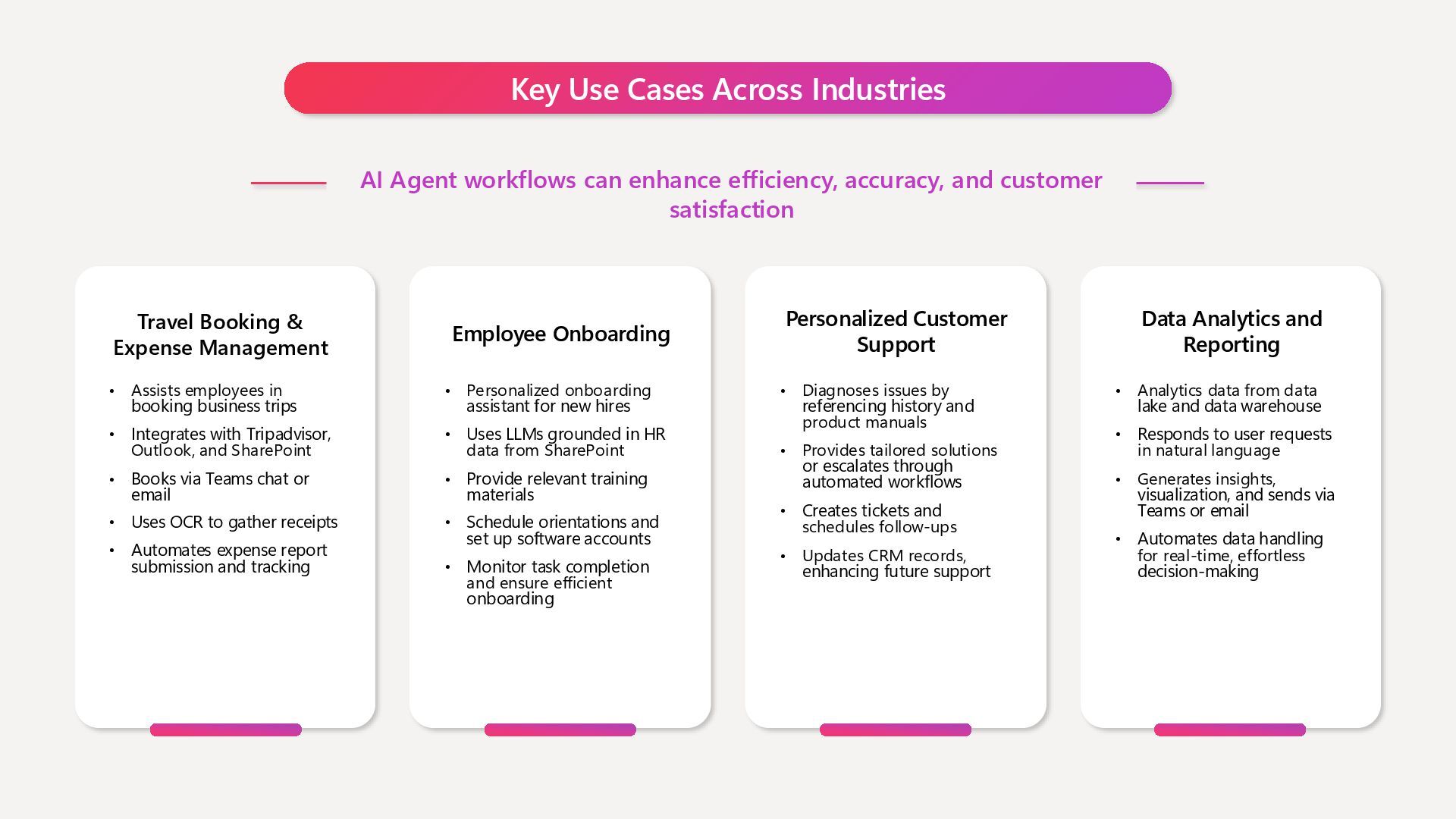 Key Use Cases Across Industries • Assists employees in booking business trips • Integrates with Tripadvisor, Outlook, and SharePoint • Books via Teams chat or email • Uses OCR to gather receipts • Automates expense report submission and tracking Travel Booking & Expense Management • Personalized onboarding assistant for new hires • Uses LLMs grounded in HR data from SharePoint • Provide relevant training materials • Schedule orientations and set up software accounts • Monitor task completion and ensure efficient onboarding Employee Onboarding • Diagnoses issues by referencing history and product manuals • Provides tailored solutions or escalates through automated workflows • Creates tickets and schedules follow-ups • Updates CRM records, enhancing future support Personalized Customer Support • Analytics data from data lake and data warehouse • Responds to user requests in natural language • Generates insights, visualization, and sends via Teams or email • Automates data handling for real-time, effortless decision-making Data Analytics and Reporting