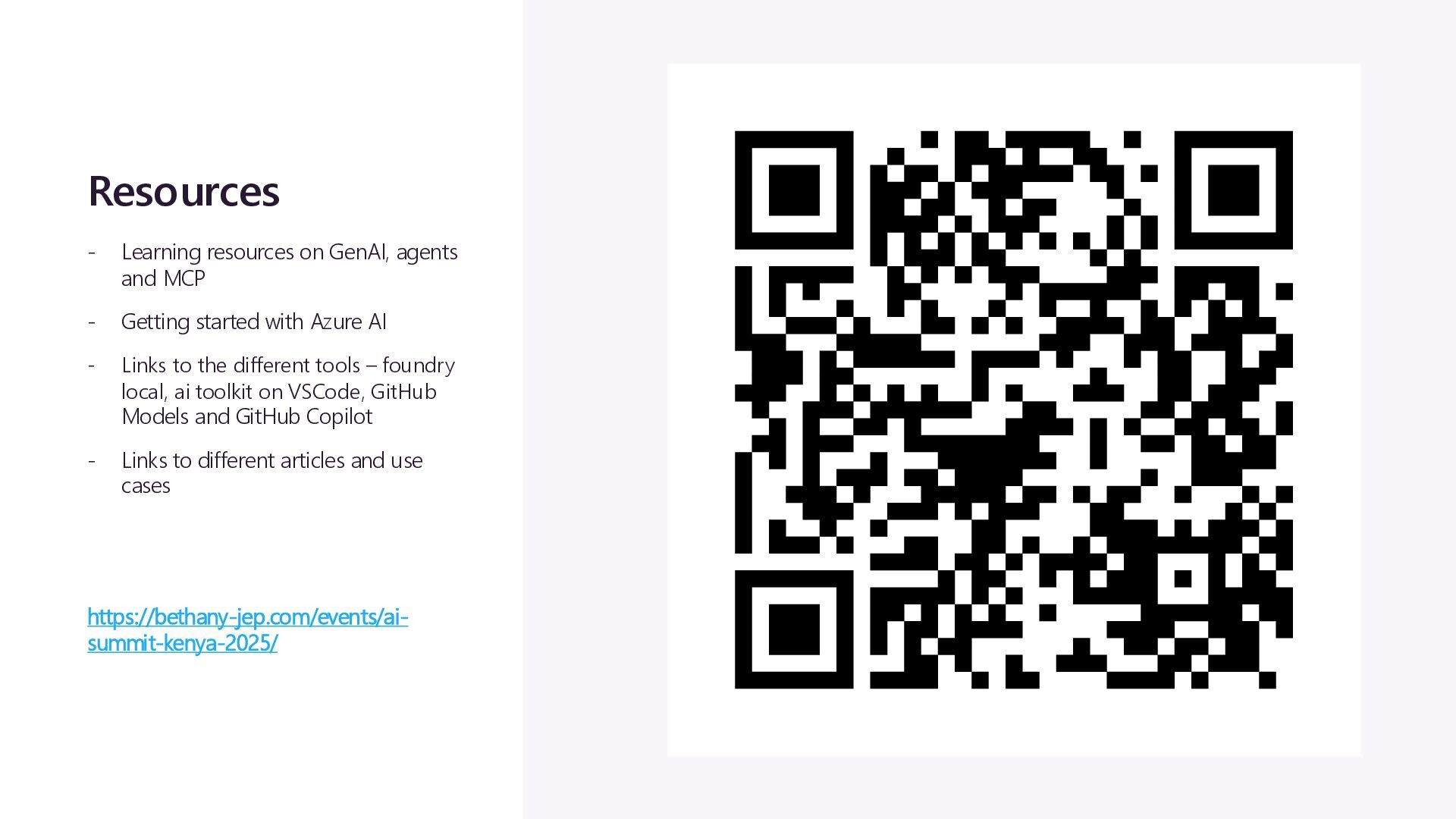 Getting started with Azure AI - Links to the different tools – foundry local, ai toolkit on VSCode, GitHub Models and GitHub Copilot - Links to different articles and use cases https://bethany-jep.com/events/ai- summit-kenya-2025/