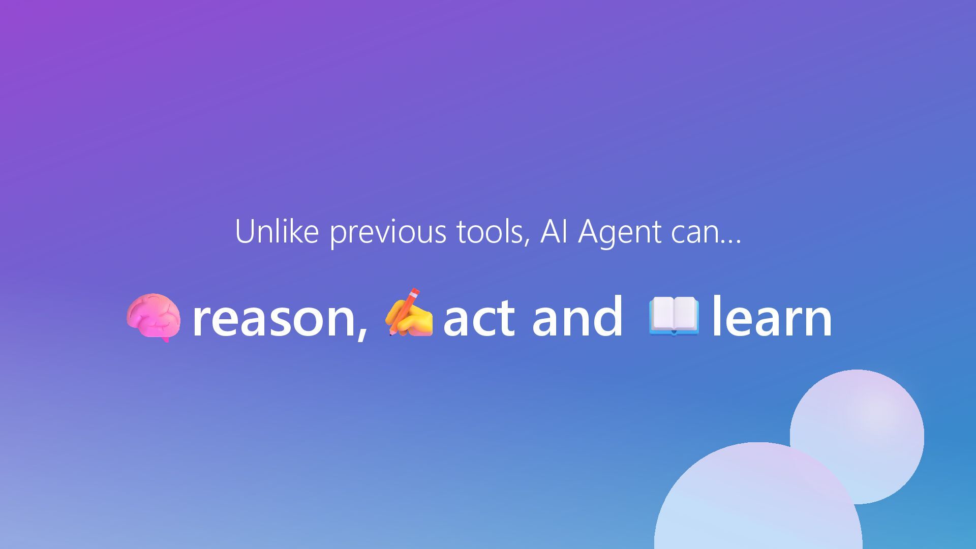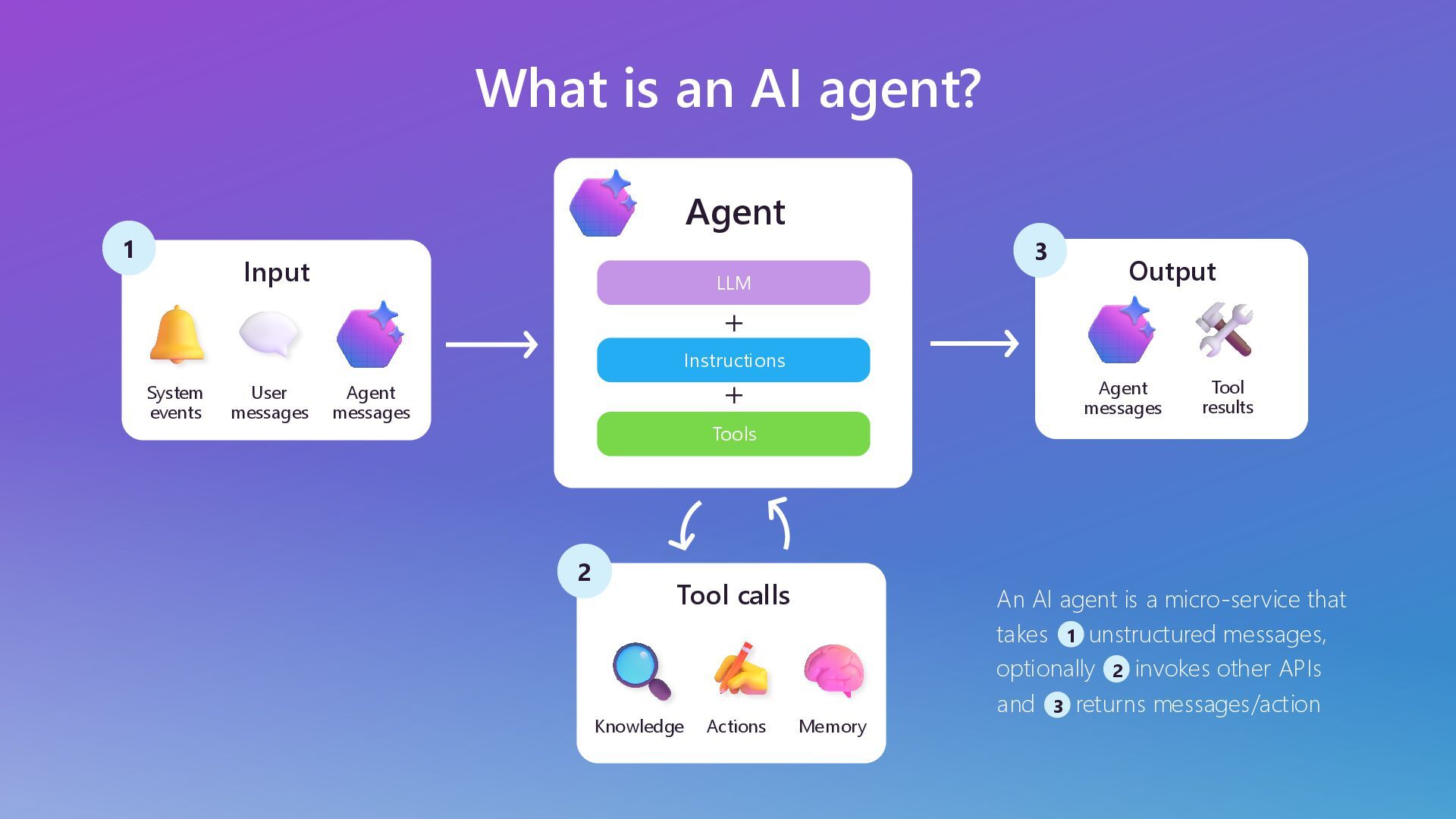 + An AI agent is a micro-service that takes unstructured messages, optionally invokes other APIs and returns messages/action 1 2 3 Input System events User messages Agent messages 1 Tool calls Knowledge Actions Memory 2 Output Agent messages Tool results 3