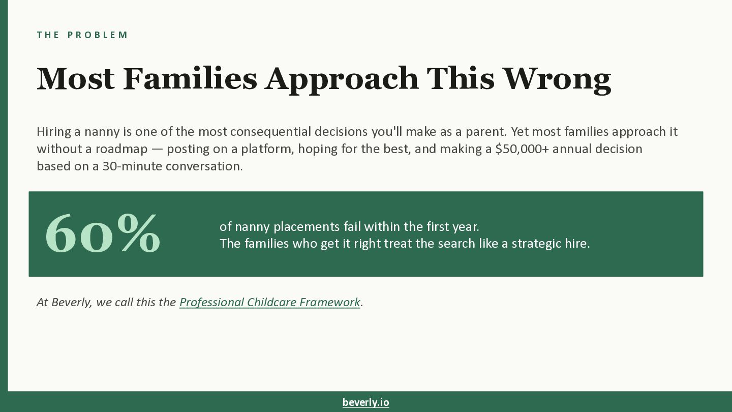 Most Families Approach This Wrong Hiring a nanny is one of the most consequential decisions you'll make as a parent. Yet most families approach it without a roadmap — posting on a platform, hoping for the best, and making a $50,000+ annual decision based on a 30-minute conversation. 60% of nanny placements fail within the first year. The families who get it right treat the search like a strategic hire. At Beverly, we call this the Professional Childcare Framework. beverly.io