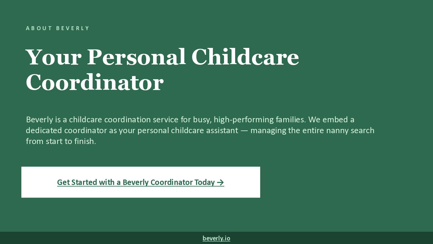 L Y Your Personal Childcare Coordinator Beverly is a childcare coordination service for busy, high-performing families. We embed a dedicated coordinator as your personal childcare assistant — managing the entire nanny search from start to finish. Get Started with a Beverly Coordinator Today → beverly.io