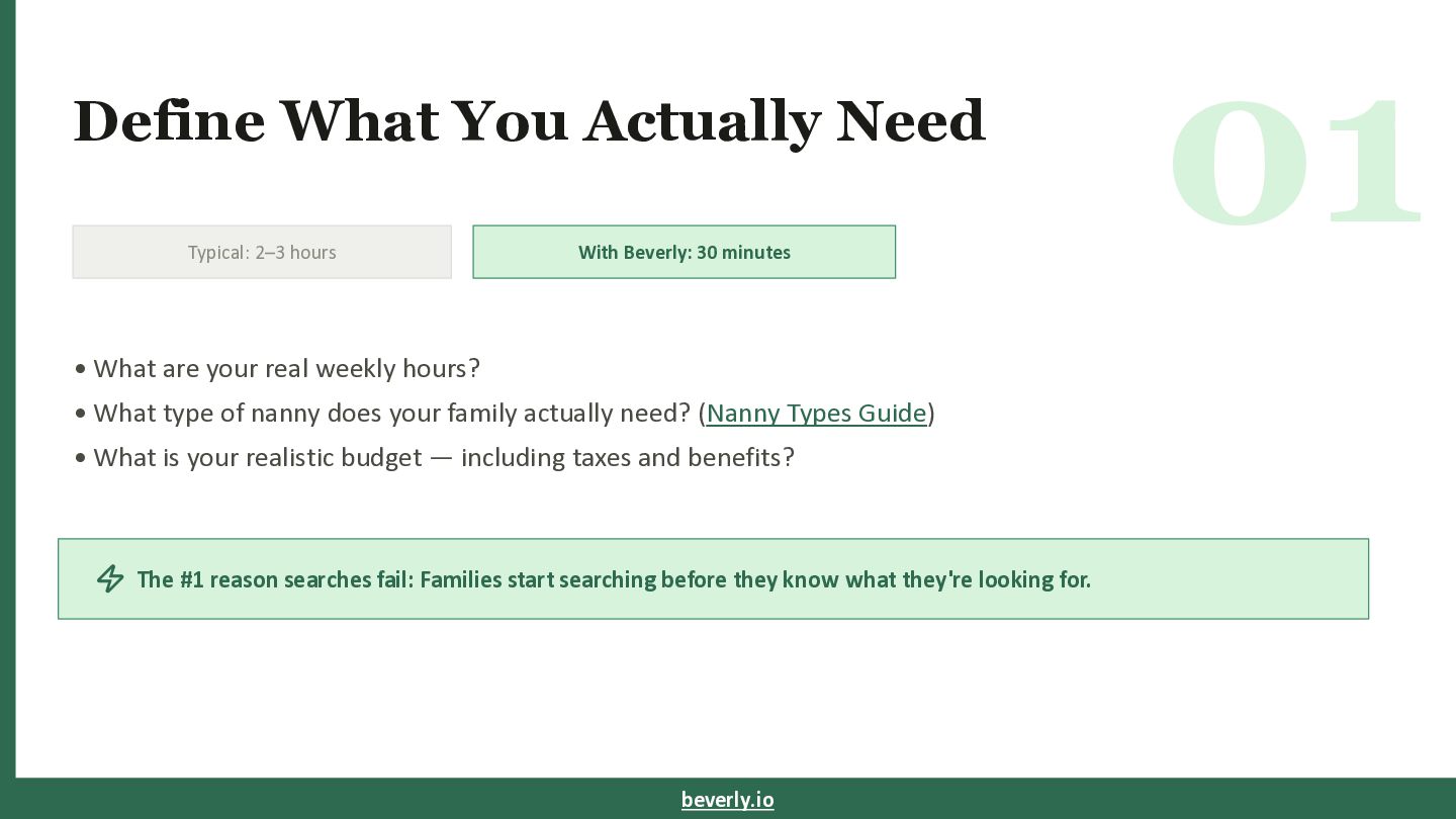 Beverly: 30 minutes • What are your real weekly hours? • What type of nanny does your family actually need? (Nanny Types Guide) • What is your realistic budget — including taxes and benefits? ⚡ The #1 reason searches fail: Families start searching before they know what they're looking for. beverly.io