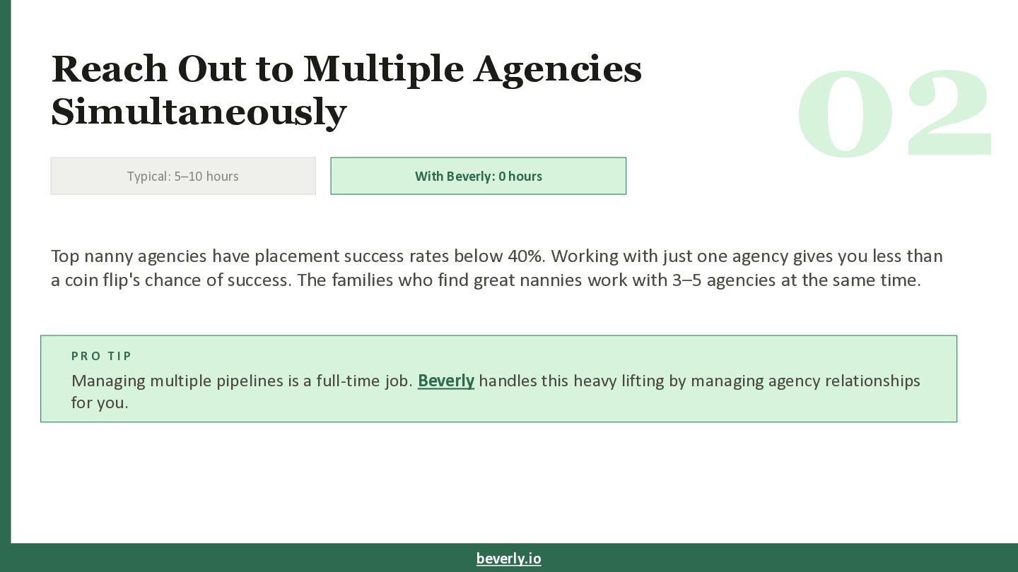 With Beverly: 0 hours Top nanny agencies have placement success rates below 40%. Working with just one agency gives you less than a coin flip's chance of success. The families who find great nannies work with 3–5 agencies at the same time. P R O T I P Managing multiple pipelines is a full-time job. Beverly handles this heavy lifting by managing agency relationships for you. beverly.io
