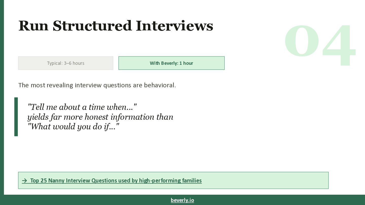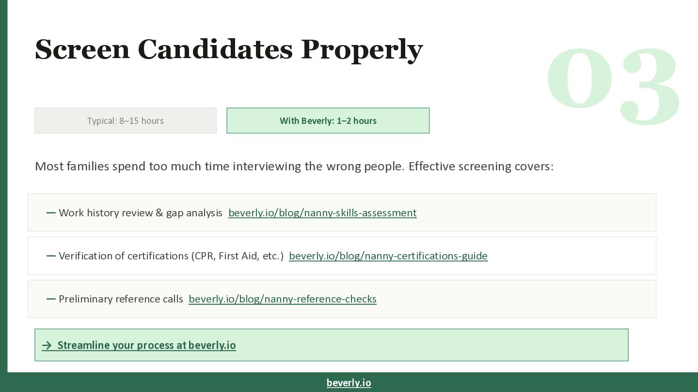 hours Most families spend too much time interviewing the wrong people. Effective screening covers: — Work history review & gap analysis beverly.io/blog/nanny-skills-assessment — Verification of certifications (CPR, First Aid, etc.) beverly.io/blog/nanny-certifications-guide — Preliminary reference calls beverly.io/blog/nanny-reference-checks → Streamline your process at beverly.io beverly.io