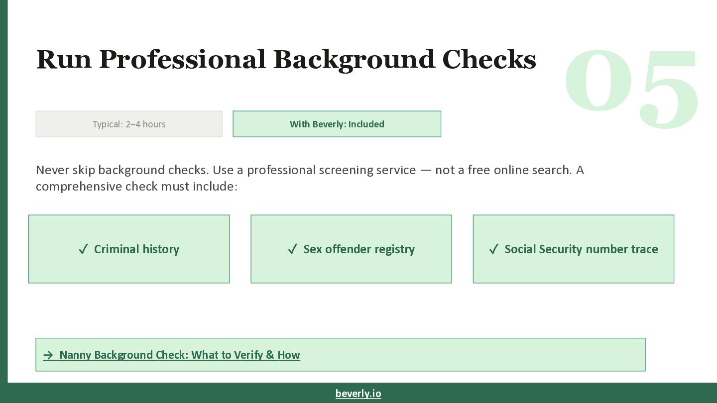 Included Never skip background checks. Use a professional screening service — not a free online search. A comprehensive check must include: ✓ Criminal history ✓ Sex offender registry ✓ Social Security number trace → Nanny Background Check: What to Verify & How beverly.io