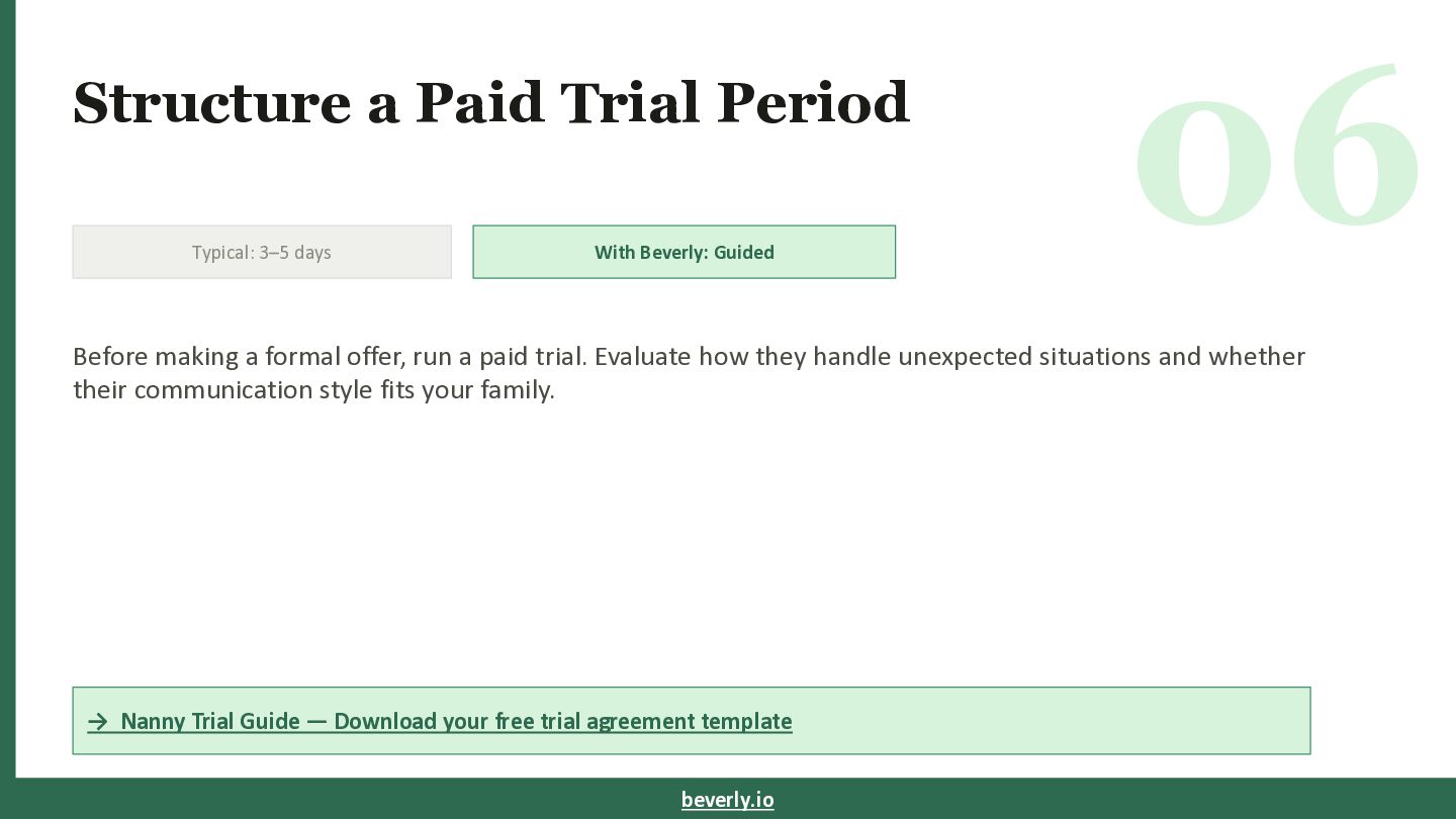 Beverly: Guided Before making a formal offer, run a paid trial. Evaluate how they handle unexpected situations and whether their communication style fits your family. → Nanny Trial Guide — Download your free trial agreement template beverly.io