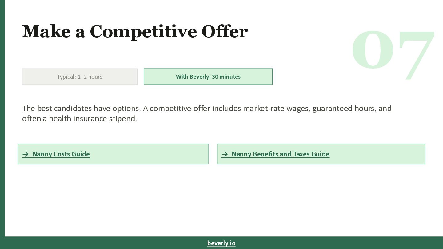 30 minutes The best candidates have options. A competitive offer includes market-rate wages, guaranteed hours, and often a health insurance stipend. → Nanny Costs Guide → Nanny Benefits and Taxes Guide beverly.io