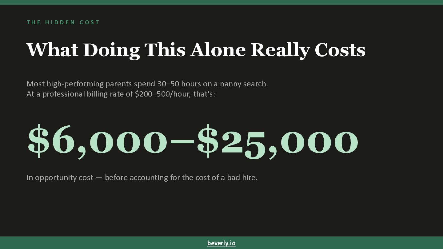O S T What Doing This Alone Really Costs Most high-performing parents spend 30–50 hours on a nanny search. At a professional billing rate of $200–500/hour, that's: $6,000–$25,000 in opportunity cost — before accounting for the cost of a bad hire. beverly.io