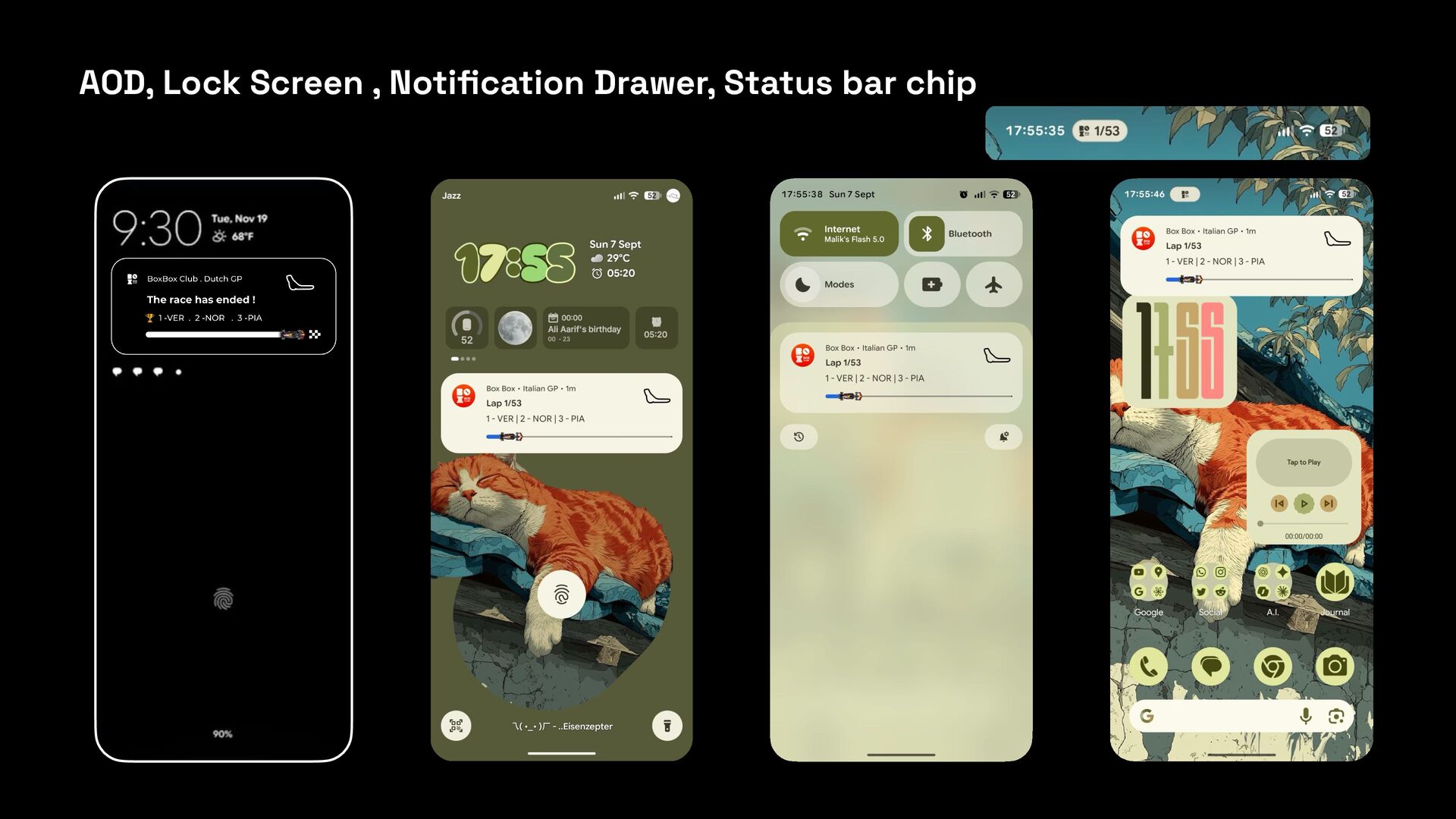 Lock Screen & AOD • Promoted to the top in Noti fi cation Drawer • Status bar chip • One persistent noti fi cation