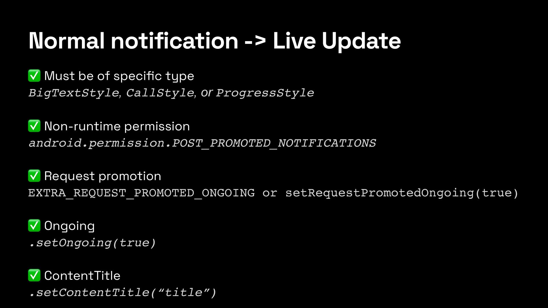 fi c type BigTextStyle, CallStyle, or ProgressStyle ✅ Non-runtime permission android.permission.POST_PROMOTED_NOTIFICATIONS ✅ Request promotion EXTRA_REQUEST_PROMOTED_ONGOING or setRequestPromotedOngoing(true) ✅ Ongoing .setOngoing(true) ✅ ContentTitle .setContentTitle(“title”)
