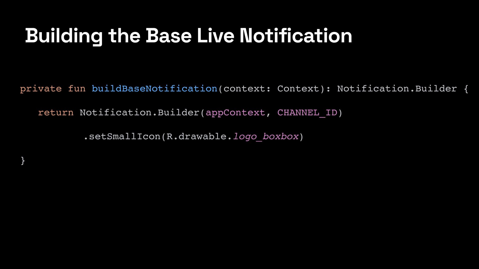 5. Building the Base Live Notification private fun buildBaseNotification(context: Context): Notification.Builder
