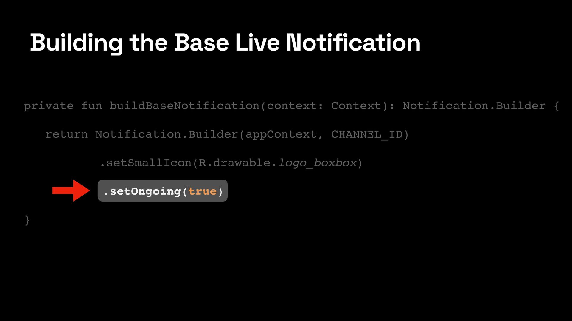 4. Building the Base Live Notification private fun buildBaseNotification(context: Context): Notification.Builder