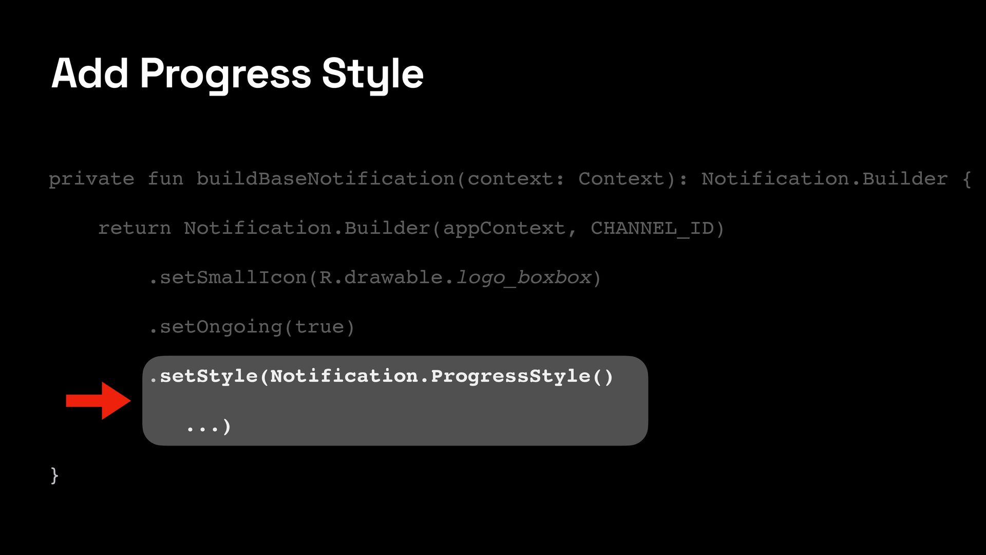 6. Add Progress Style private fun buildBaseNotification(context: Context): Notification.Builder { return