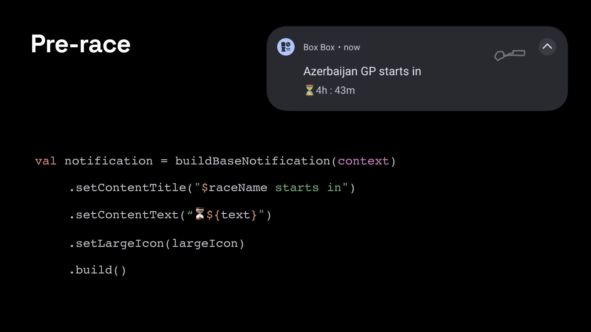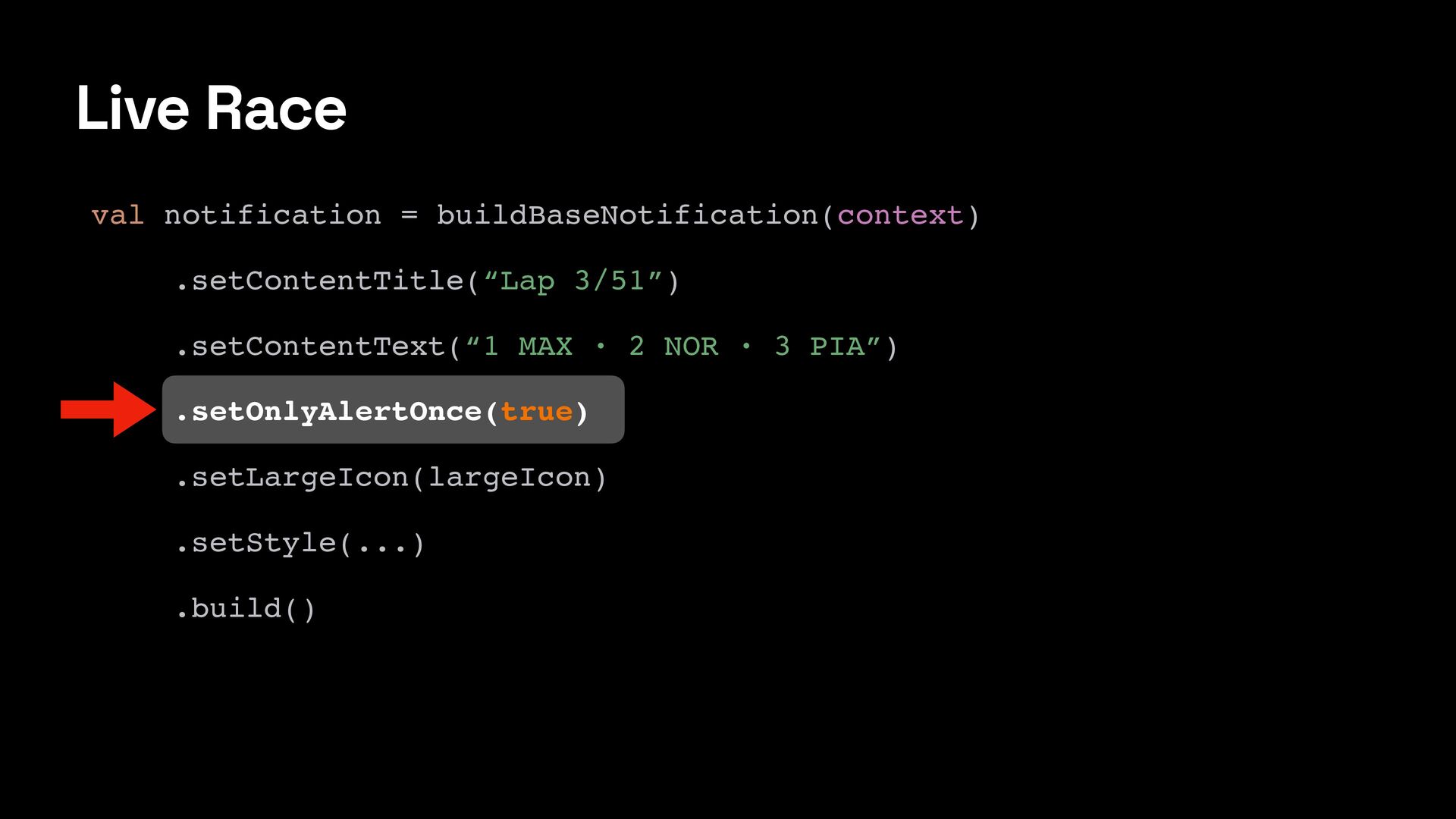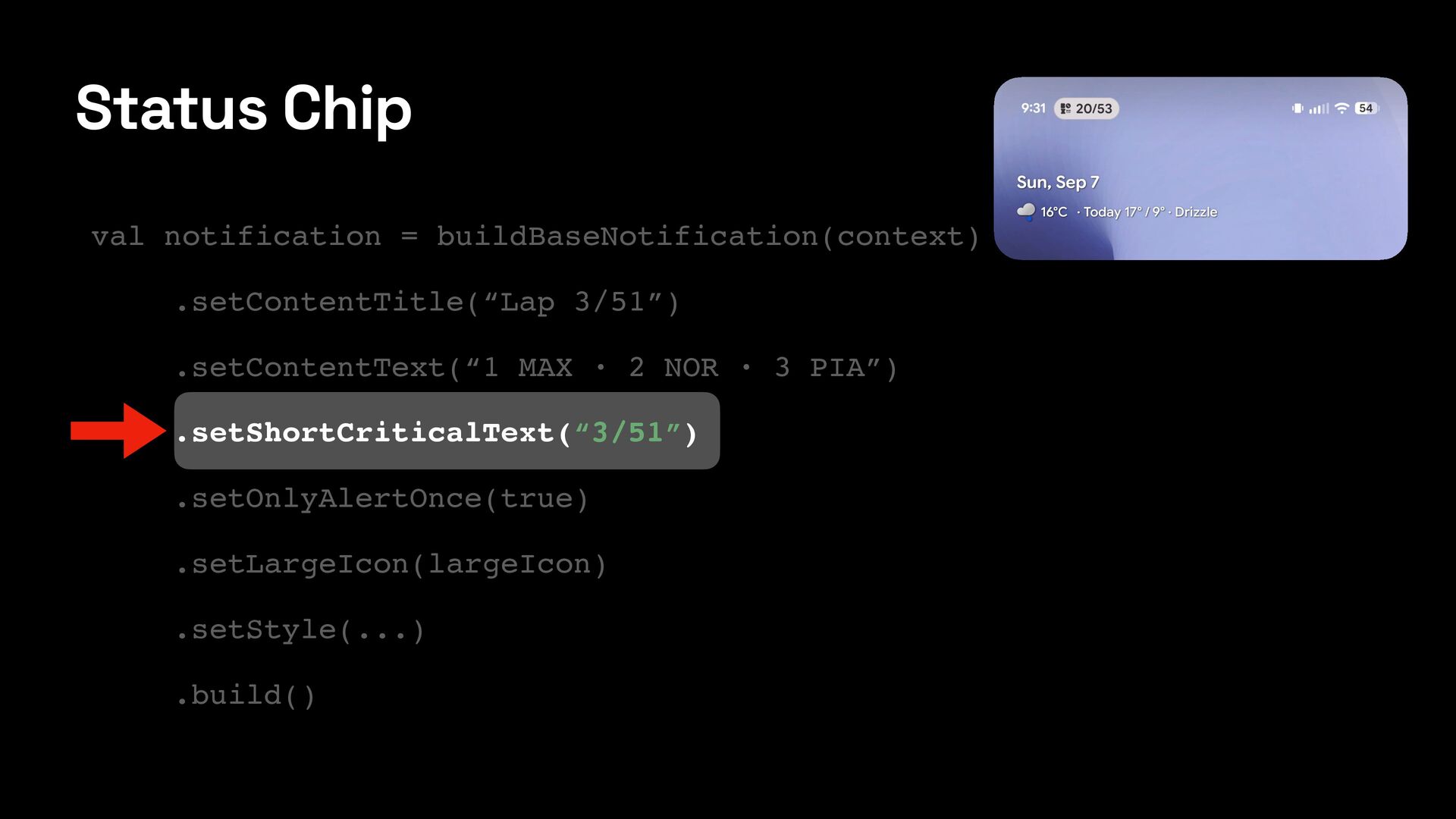 10. val notification = buildBaseNotification(context) .setContentTitle(“Lap 3/51”) .setContentText(“1 MAX · 2