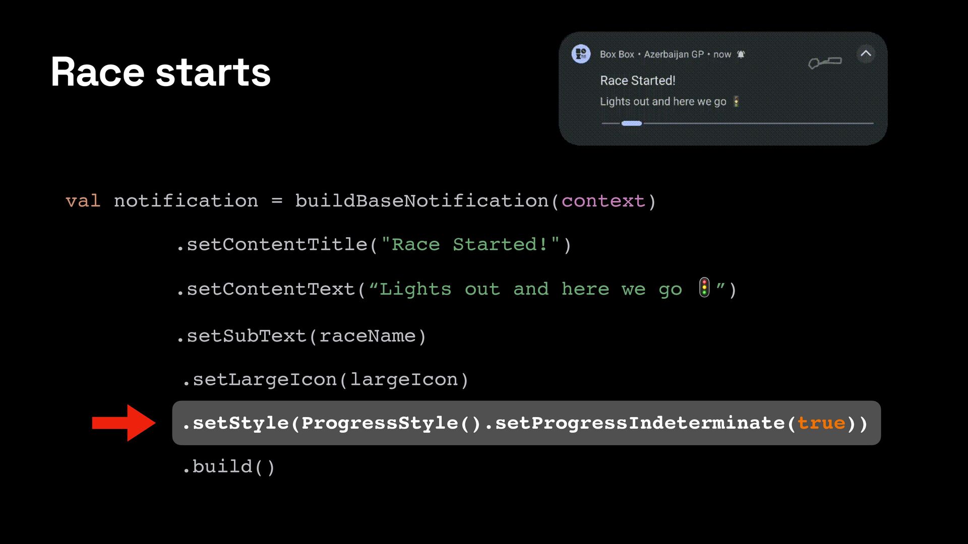 and here we go 🚦”) .setSubText(raceName) .setLargeIcon(largeIcon) .setStyle(ProgressStyle().setProgressIndeterminate(true)) .build()