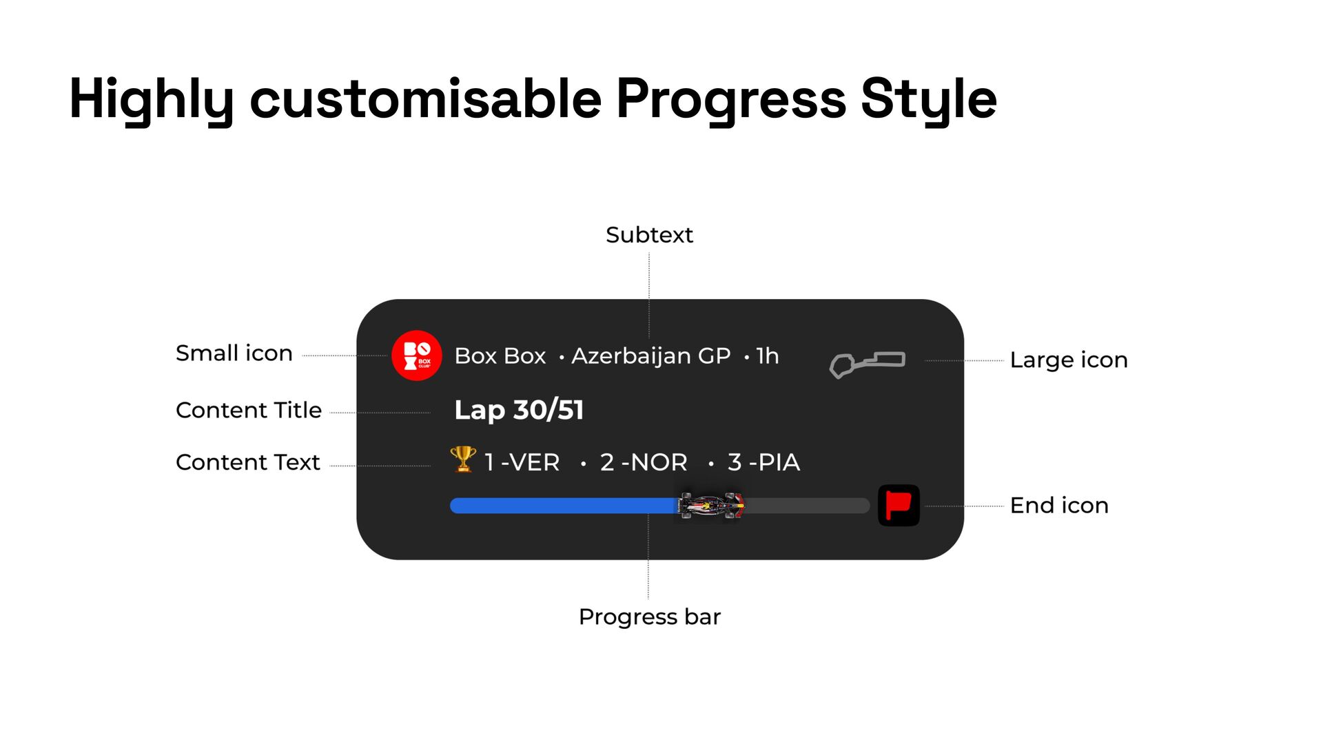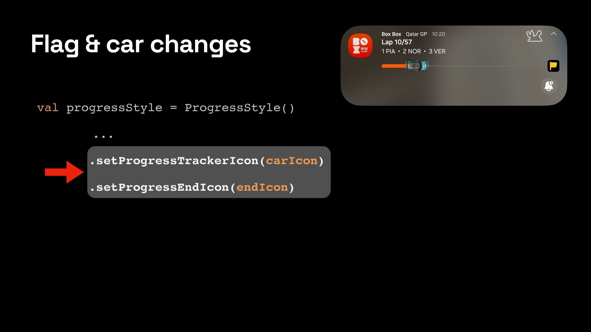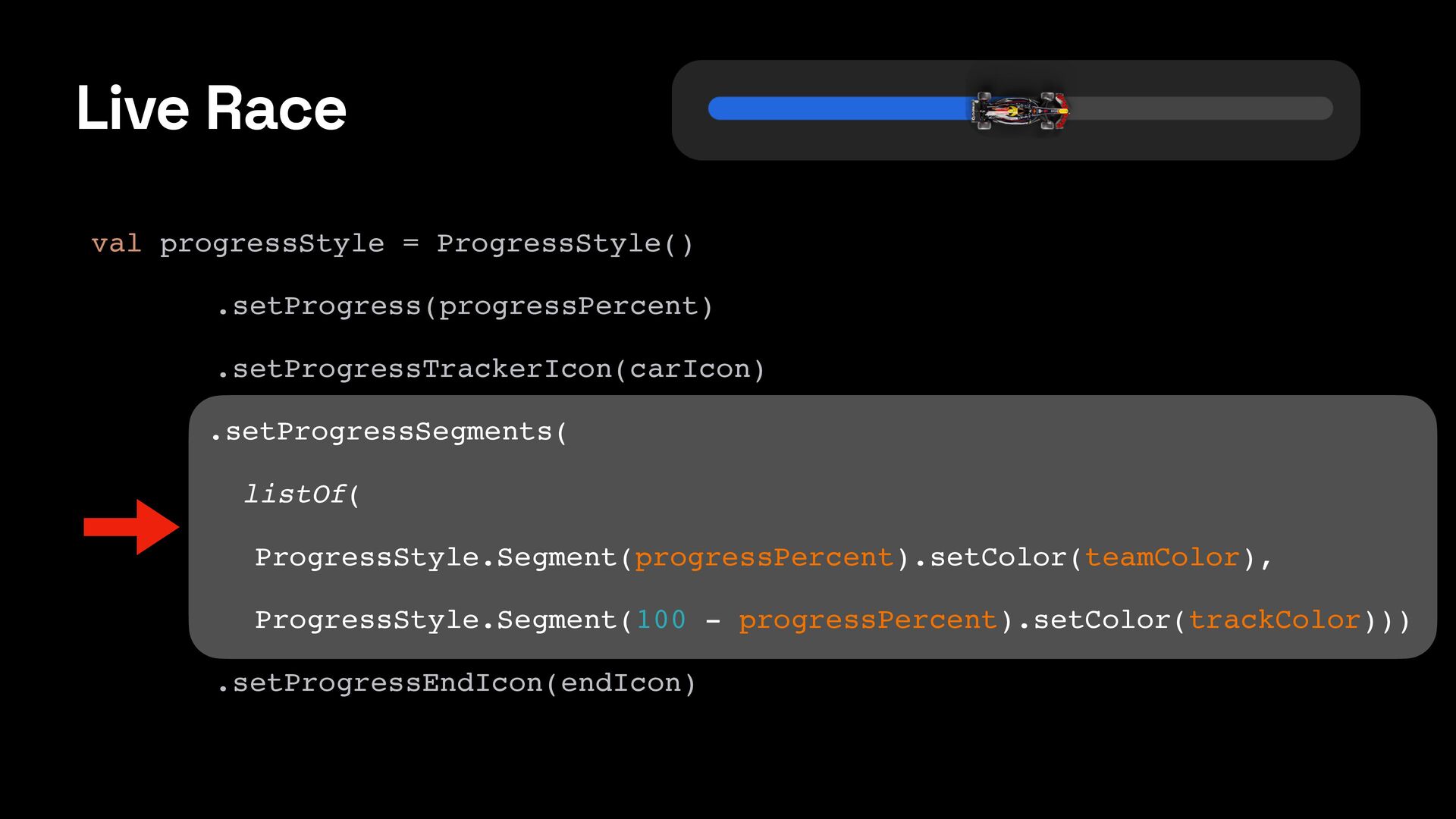 9. Live Race val progressStyle = ProgressStyle() .setProgress(progressPercent) .setProgressTrackerIcon(carIcon) .setProgressSegments( listOf(