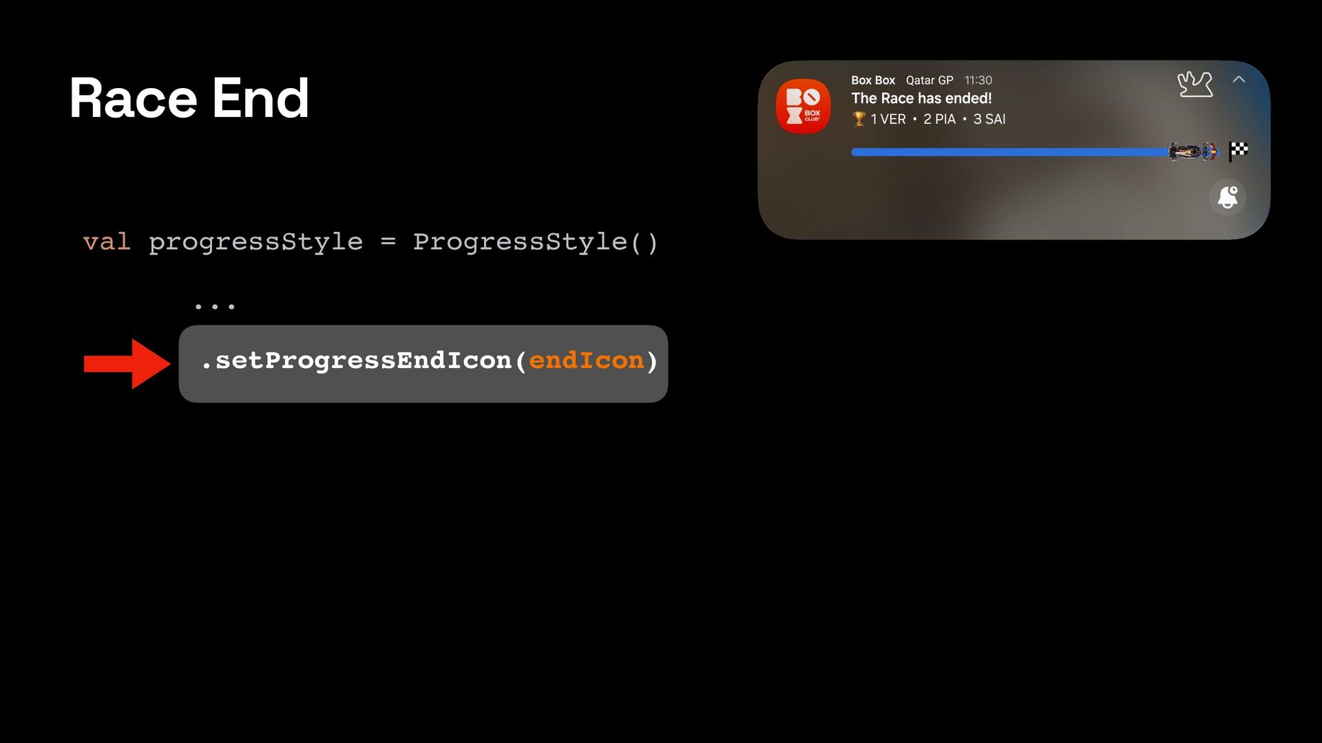 Notification.Builder(appContext, CHANNEL_ID) .setSmallIcon(R.drawable.logo_boxbox) .setOngoing(true) .setStyle(Notification.ProgressStyle() ...) }