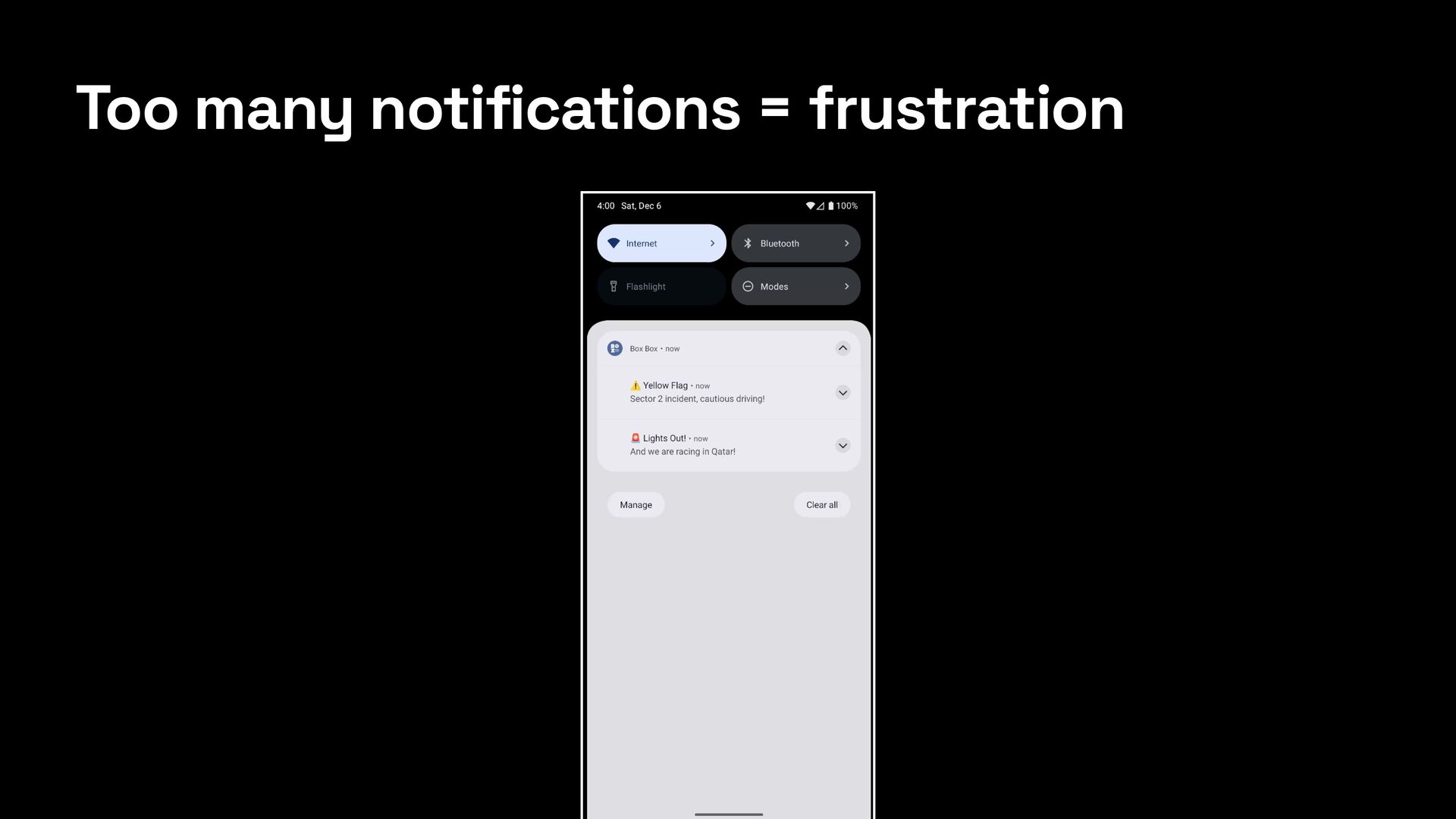 7. Race starts val notification = buildBaseNotification(context) .setContentTitle("Race Started!") .setContentText(“Lights out