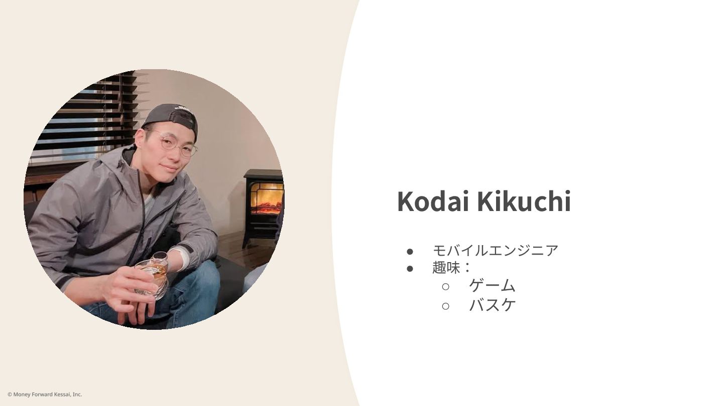 Kodai Kikuchi • モバイルエンジニア • 趣味: ◦ ゲーム ◦ バスケ