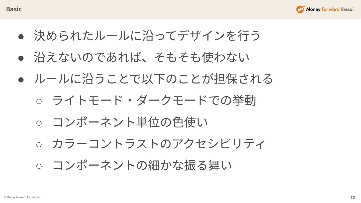 Basic 12 • 決められたルールに沿ってデザインを⾏う • 沿えないのであれば、そもそも使わない • ルールに沿うことで以下のことが担保される ◦ ライトモード‧ダークモードでの挙動