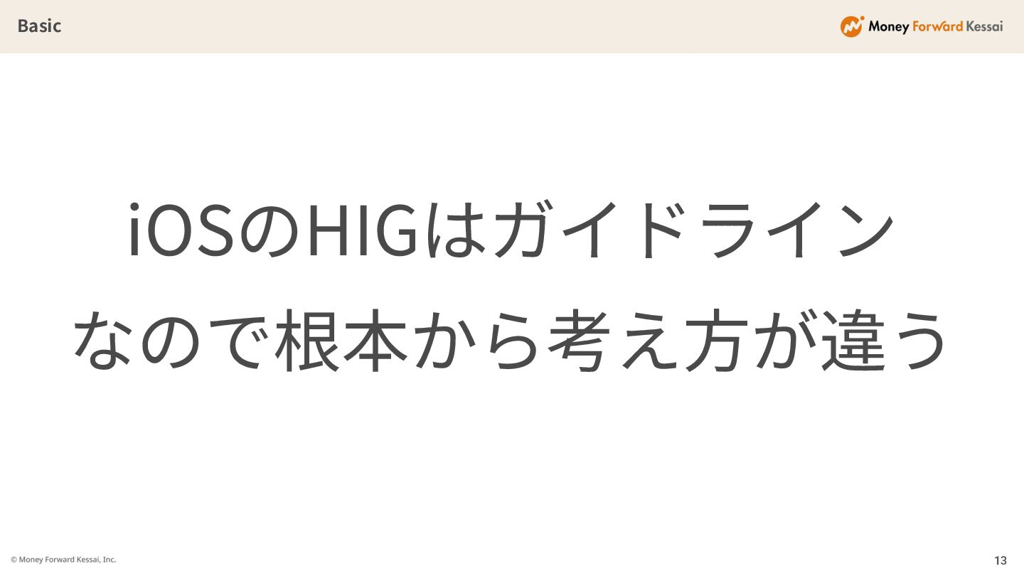Basic iOSのHIGはガイドライン なので根本から考え⽅が違う 13