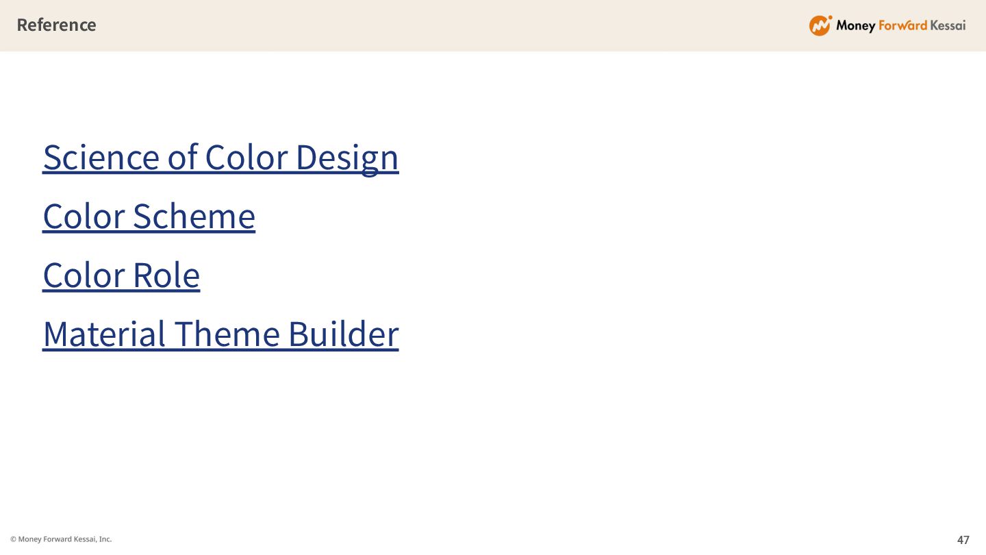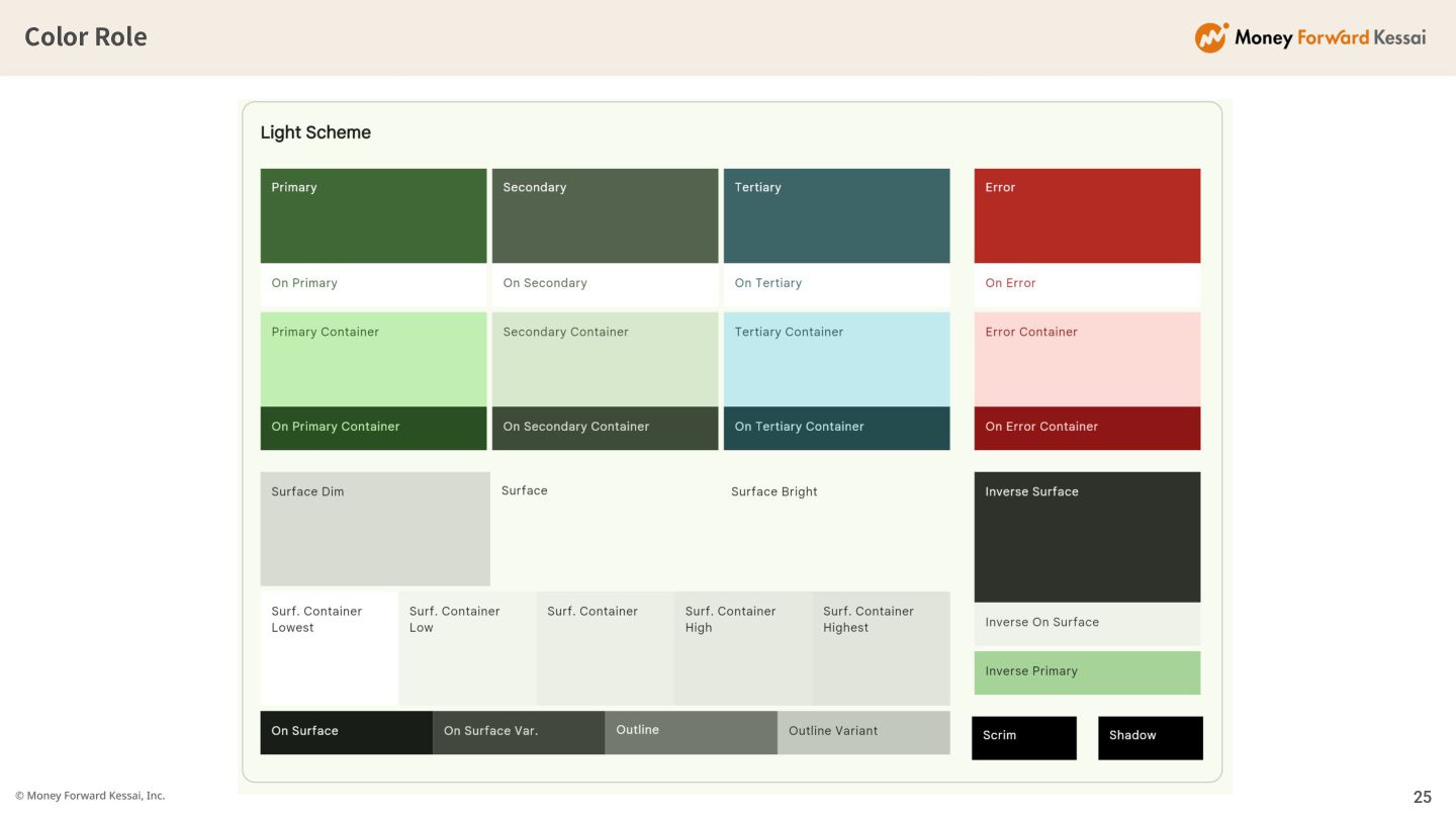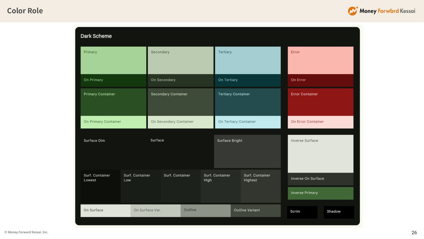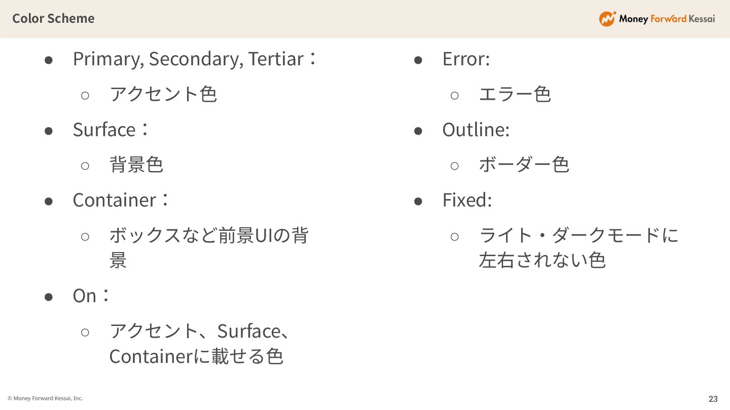 Surface: ◦ 背景⾊ • Container: ◦ ボックスなど前景UIの背 景 • On: ◦ アクセント、Surface、 Containerに載せる⾊ • Error: ◦ エラー⾊ • Outline: ◦ ボーダー⾊ • Fixed: ◦ ライト‧ダークモードに 左右されない⾊