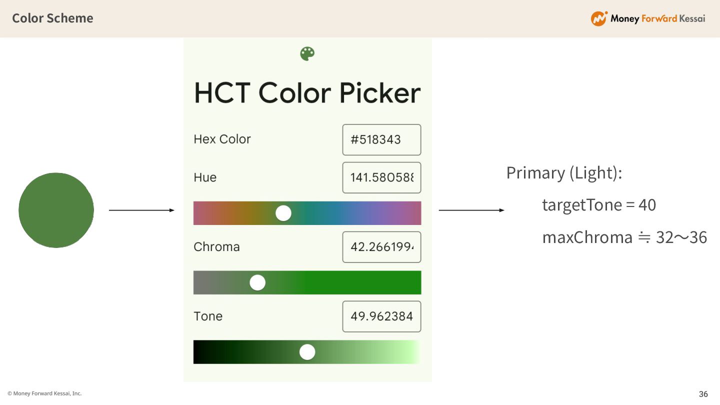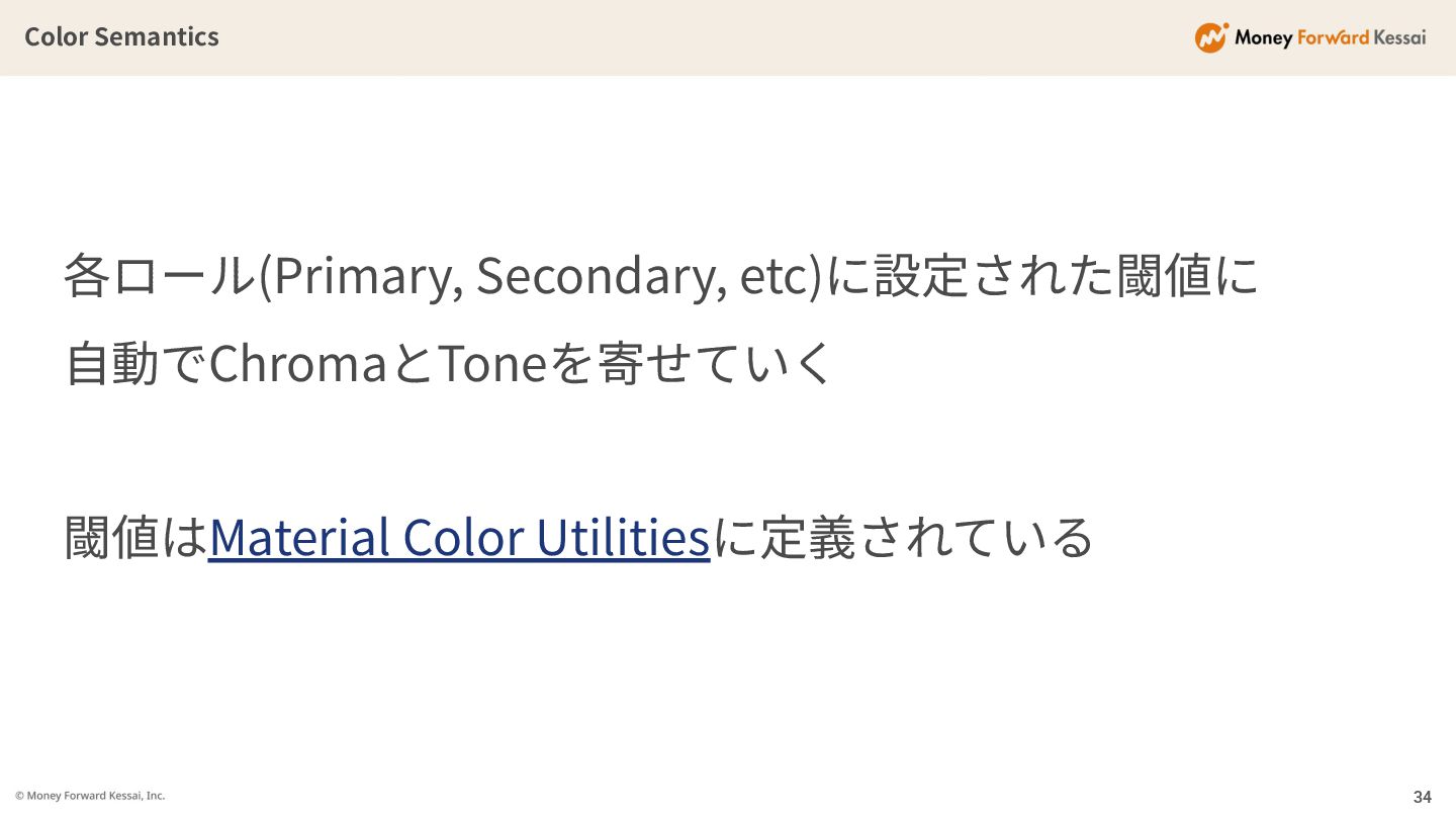 Color Semantics 34 各ロール(Primary, Secondary, etc)に設定された閾値に ⾃動でChromaとToneを寄せていく 閾値はMaterial Color Utilitiesに定義されている