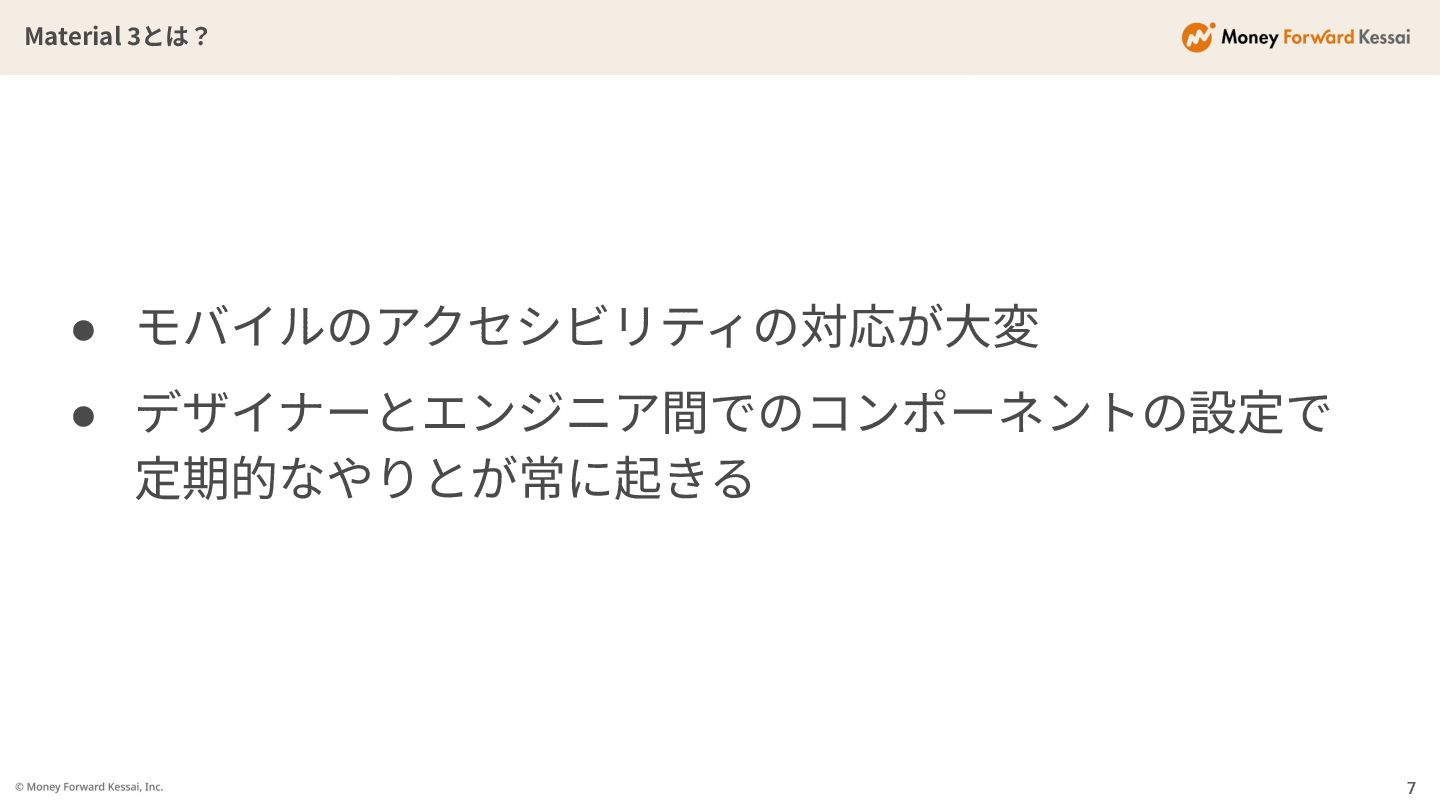 Material 3とは? 7 • モバイルのアクセシビリティの対応が⼤変 • デザイナーとエンジニア間でのコンポーネントの設定で 定期的なやりとが常に起きる