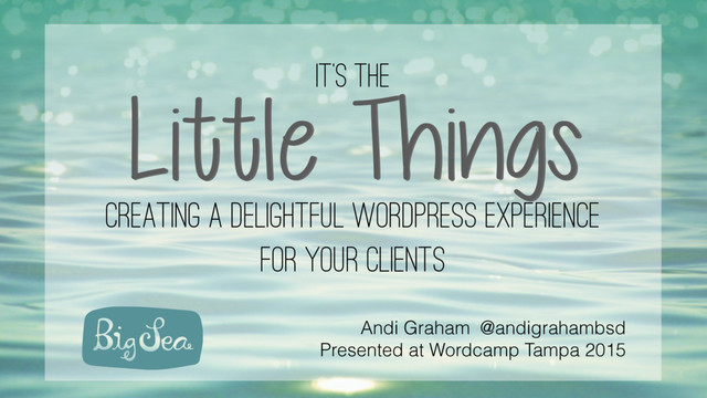 Project management at an agency can be the difference between a raving fan or a disappointed ex. In this presentation, Andi discusses some approaches we use at Big Sea during the design, development and hand-off of a WordPress project to ensure a delightful outcome for the client -- one that has helped Big Sea succeed with raving fans for the past 10 years.