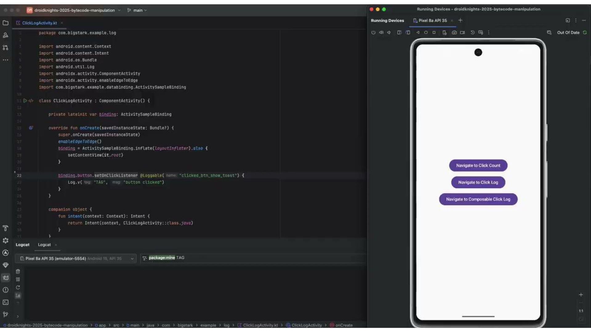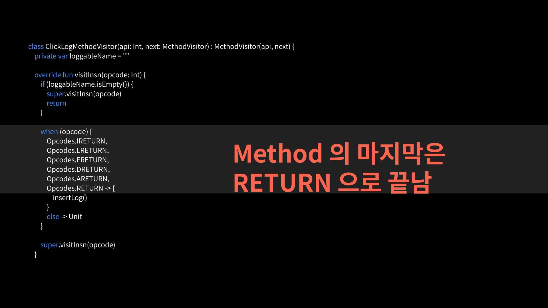 MethodVisitor(api, next) { override fun visitCode() { super.visitCode() visitVarInsn(Opcodes.ALOAD, viewVarIndex) // View 객체 가져오기 visitMethodInsn( Opcodes.INVOKEVIRTUAL, // 메소드 실행 "android/view/View", // View 의 "getTag", // getTag 메소드를 "()Ljava/lang/Object;", // parameter 는 없고, 반환값은 Object (Stack 에 푸시) false ) … visitMethodInsn( Opcodes.INVOKESTATIC, // static 메소드 실행 "android/util/Log", // Log 의 "v", // v 메소드를 "(Ljava/lang/String;Ljava/lang/String;)I", // parameter 는 String 2개, 반환값은 Int (Stack 에 푸시) false ) visitInsn(Opcodes.POP) // Stack 에서 제거 } } INVOKEVIRTUAL … INVOKESTATIC POP ALOAD 1