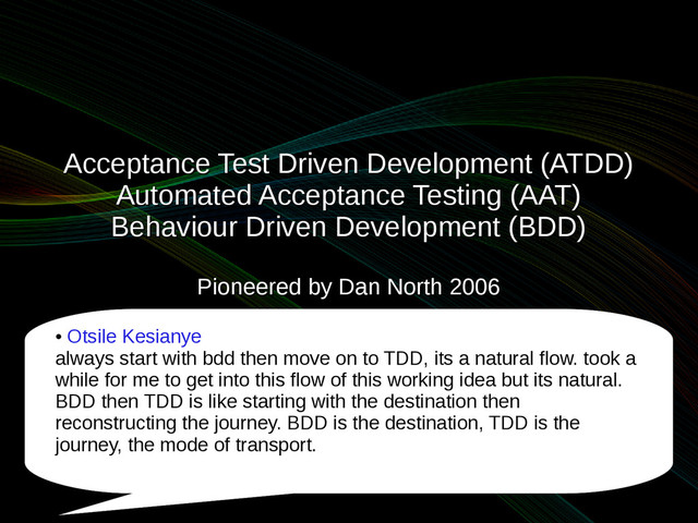In this session I went over the benefits of introducing TDD and BDD: How to introduce them, their differences, how to deal with push back from team members and upper management.