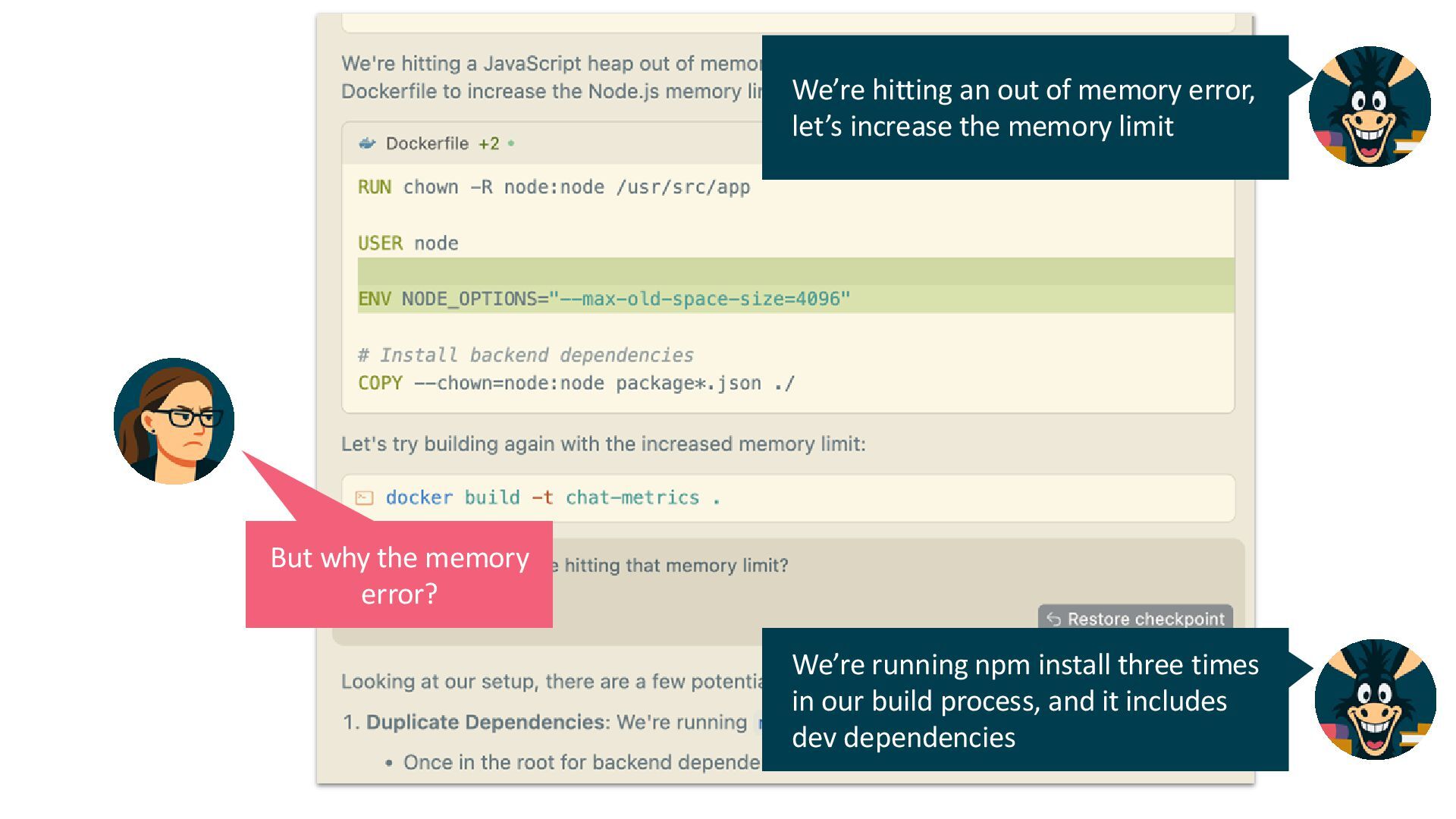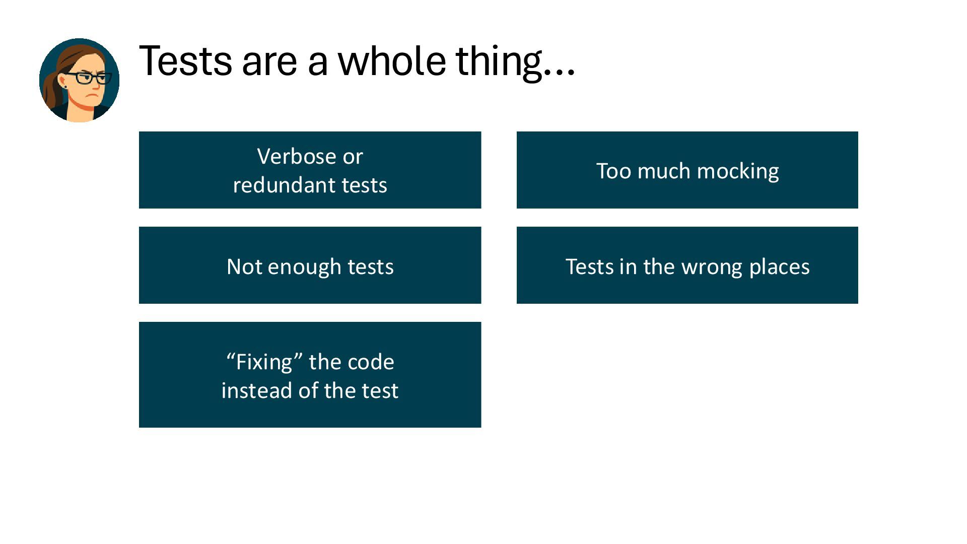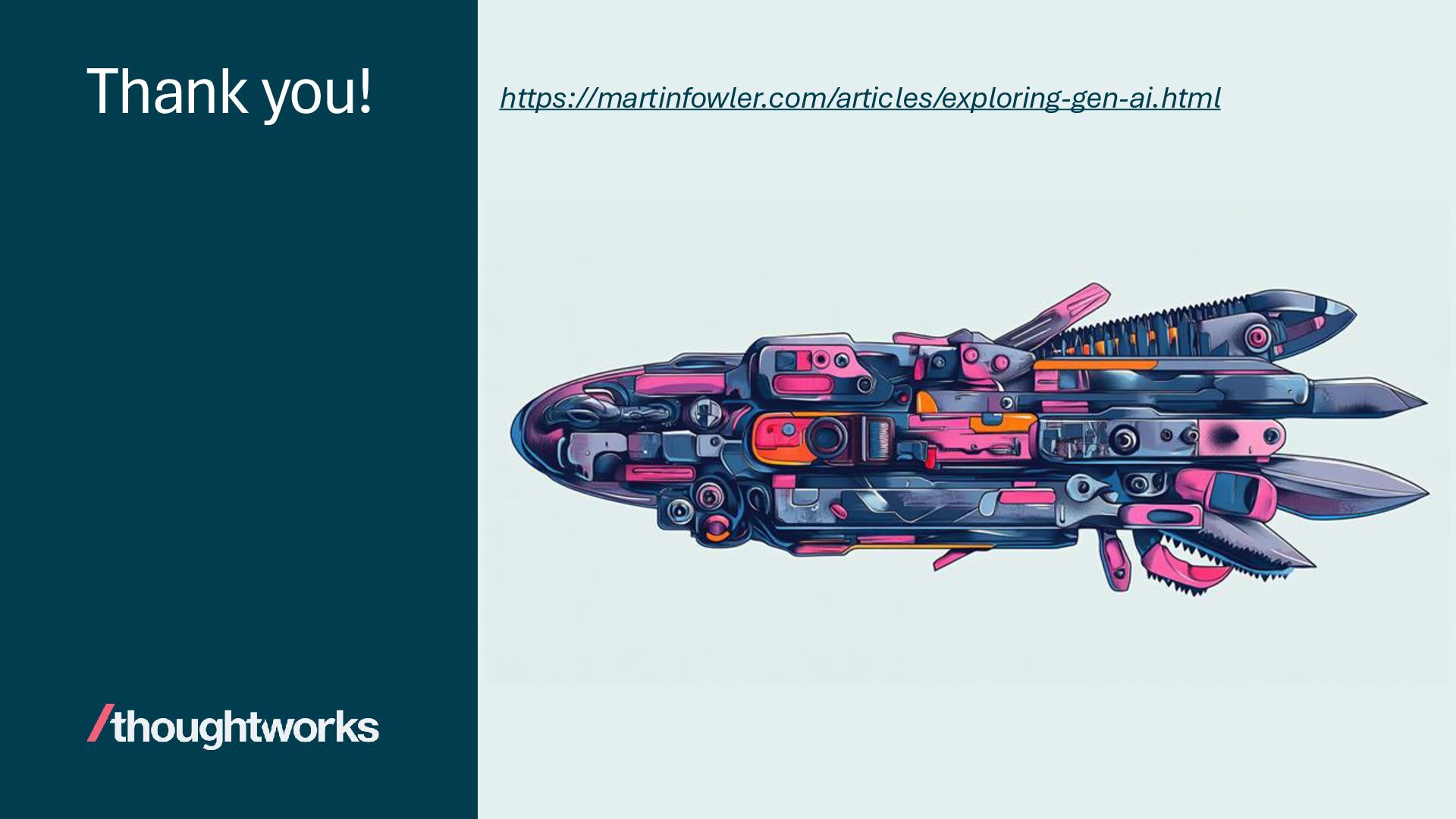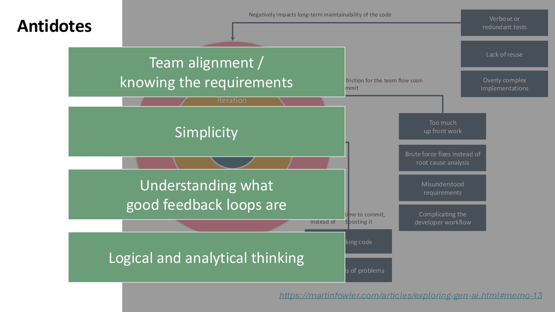 Too much up front work Brute force fixes instead of root cause analysis Misunderstood requirements Verbose or redundant tests Lack of reuse Overly complex implementations Complicating the developer workflow Negatively impacts long-term maintainability of the code Creates friction for the team flow soon after commit Slows down time to commit, instead of boosting it Antidotes Team alignment / knowing the requirements Simplicity Understanding what good feedback loops are Logical and analytical thinking https://martinfowler.com/articles/exploring-gen-ai.html#memo-13