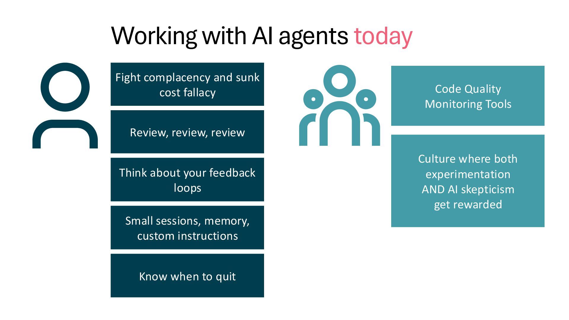 Know when to quit Fight complacency and sunk cost fallacy Review, review, review Culture where both experimentation AND AI skepticism get rewarded Code Quality Monitoring Tools Small sessions, memory, custom instructions