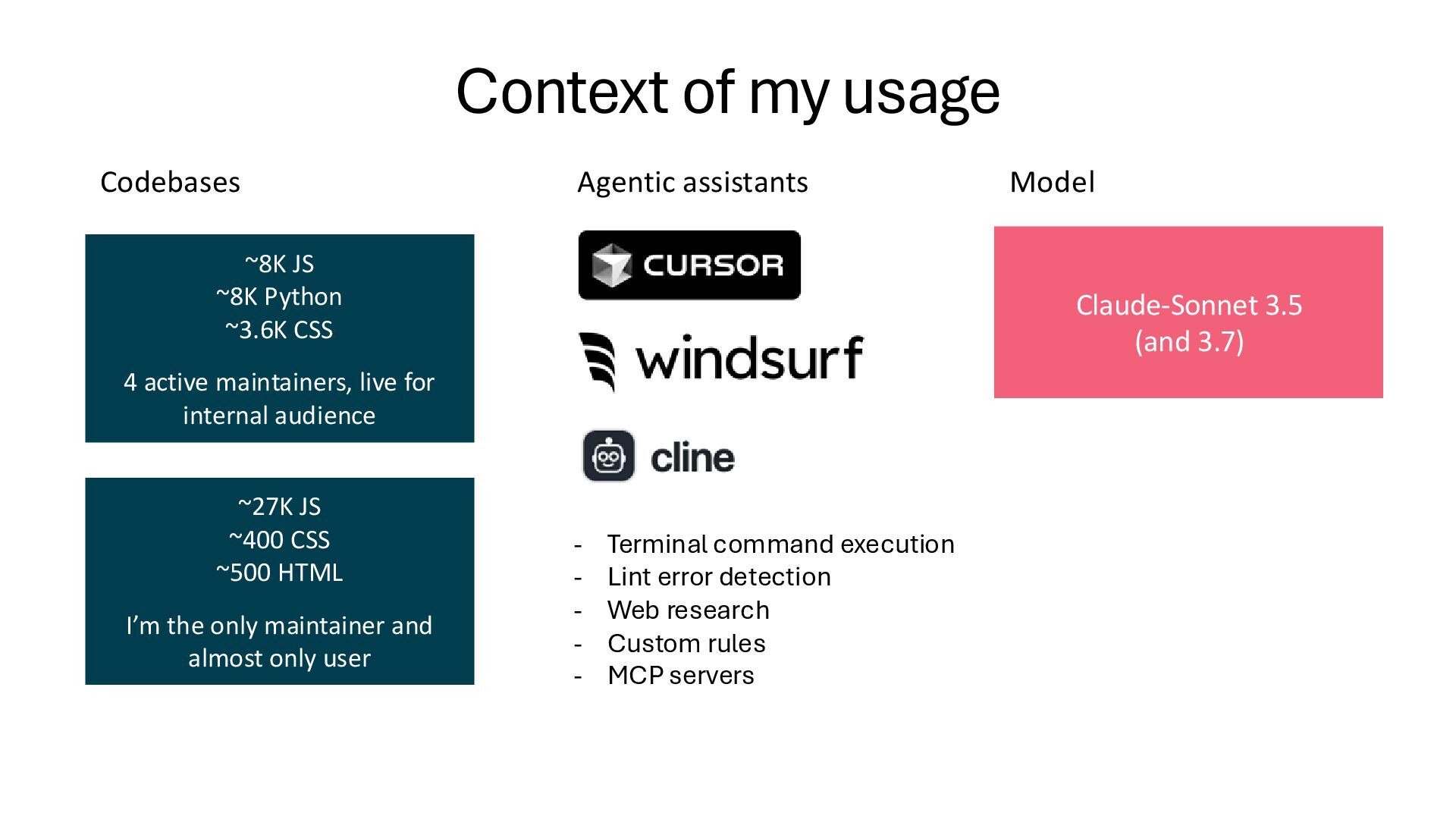 4 active maintainers, live for internal audience ~27K JS ~400 CSS ~500 HTML I’m the only maintainer and almost only user Codebases Agentic assistants Model Claude-Sonnet 3.5 (and 3.7) - Terminal command execution - Lint error detection - Web research - Custom rules - MCP servers