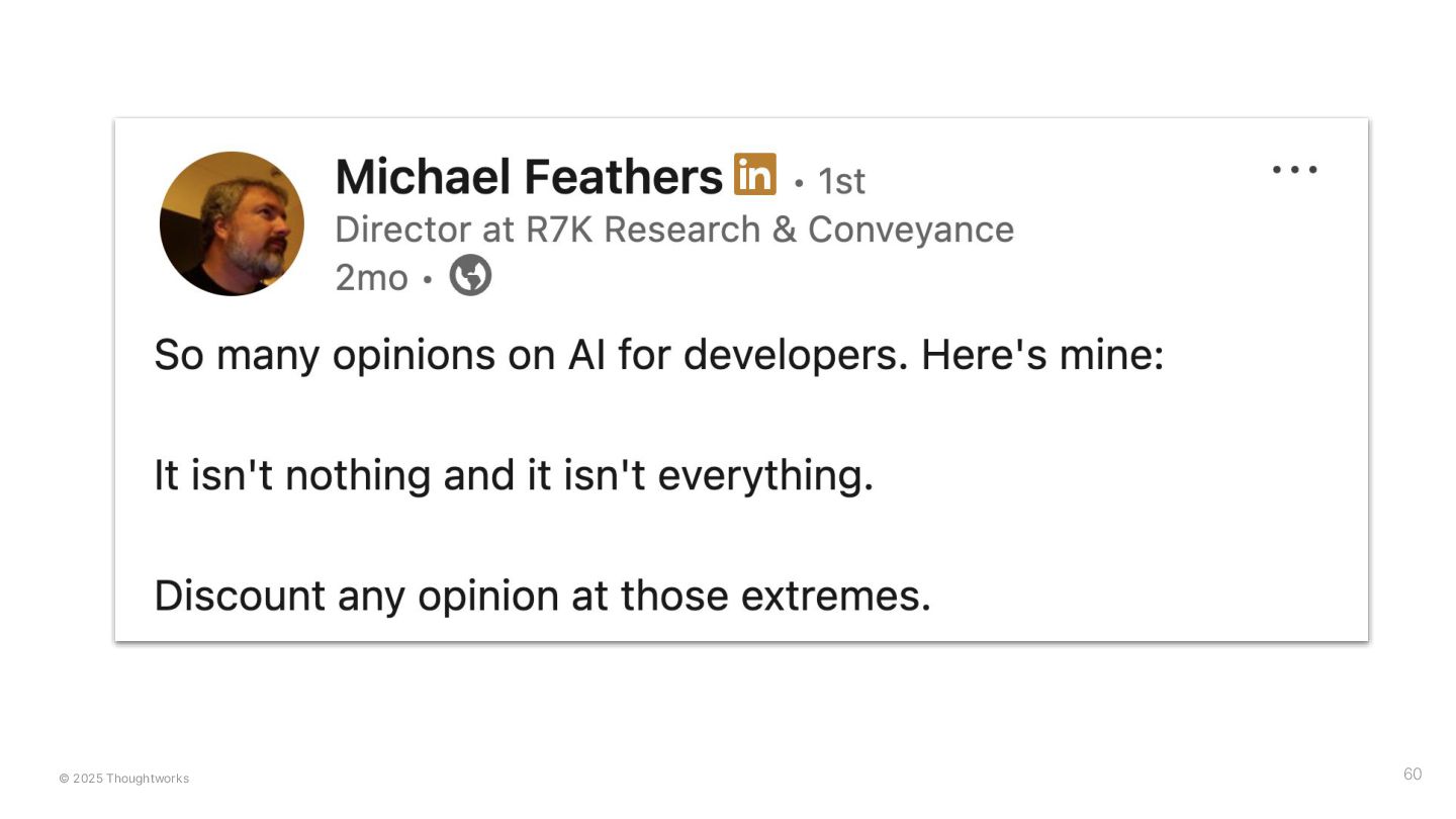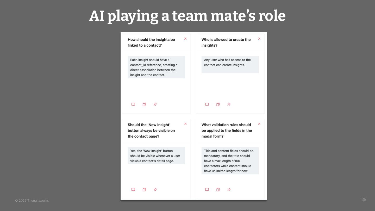 Thoughtworks Use of AI can easily lead to divergence rather than convergence. I have spent a lot of time revisiting design decision every time a new AI-generated idea comes up