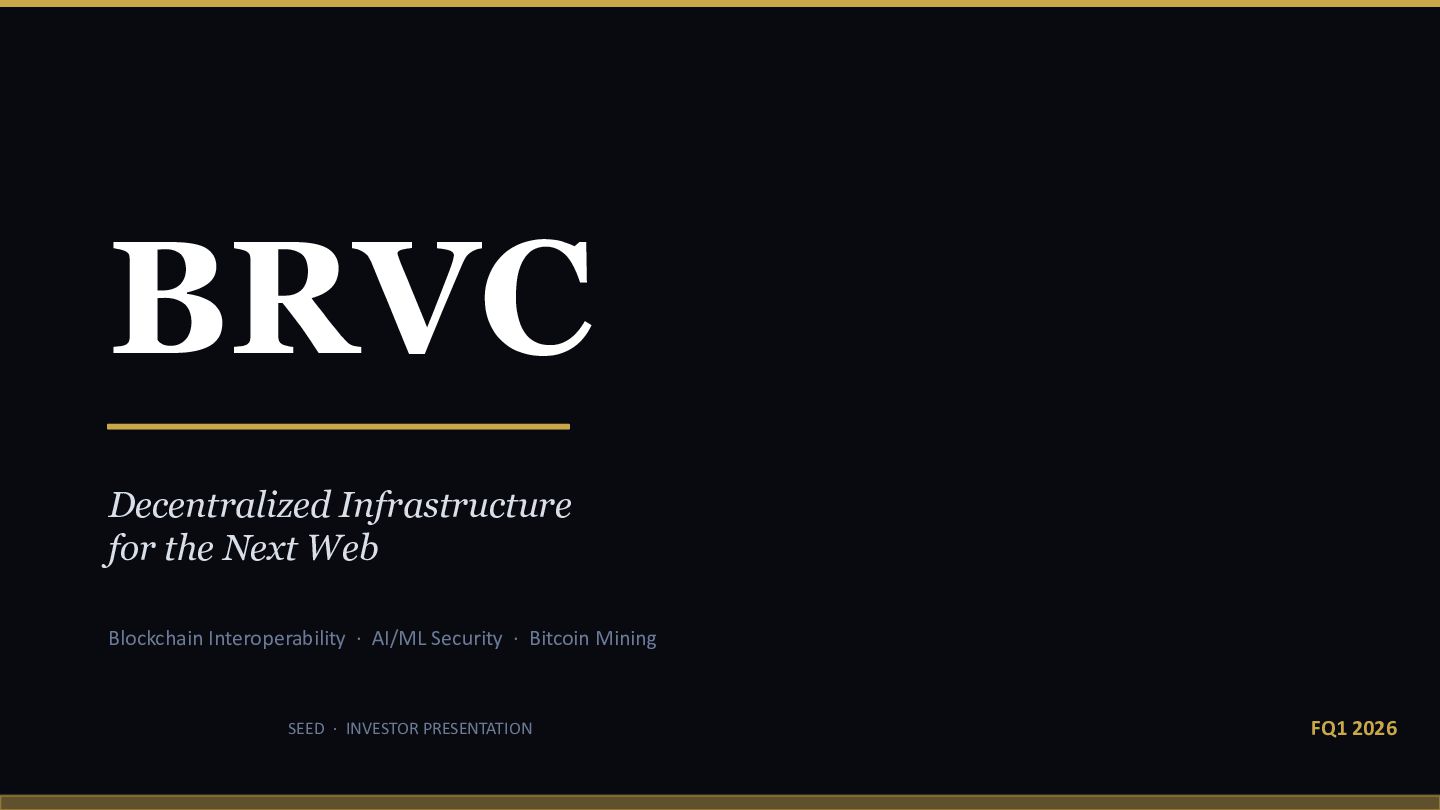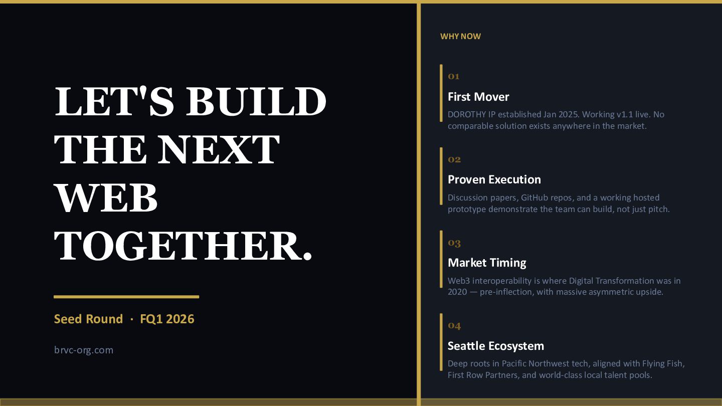 2026 brvc-org.com WHY NOW 01 First Mover DOROTHY IP established Jan 2025. Working v1.1 live. No comparable solution exists anywhere in the market. 02 Proven Execution Discussion papers, GitHub repos, and a working hosted prototype demonstrate the team can build, not just pitch. 03 Market Timing Web3 interoperability is where Digital Transformation was in 2020 — pre-inflection, with massive asymmetric upside. 04 Seattle Ecosystem Deep roots in Pacific Northwest tech, aligned with Flying Fish, First Row Partners, and world-class local talent pools.