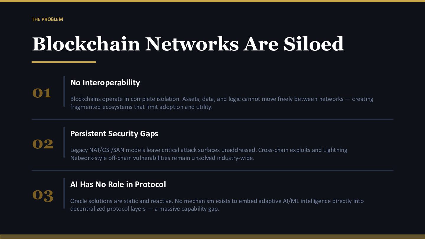 operate in complete isolation. Assets, data, and logic cannot move freely between networks — creating fragmented ecosystems that limit adoption and utility. 02 Persistent Security Gaps Legacy NAT/OSI/SAN models leave critical attack surfaces unaddressed. Cross-chain exploits and Lightning Network-style off-chain vulnerabilities remain unsolved industry-wide. 03 AI Has No Role in Protocol Oracle solutions are static and reactive. No mechanism exists to embed adaptive AI/ML intelligence directly into decentralized protocol layers — a massive capability gap.