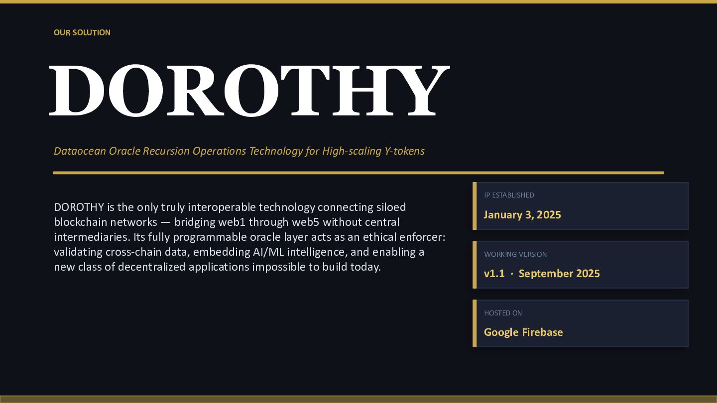 Y-tokens DOROTHY is the only truly interoperable technology connecting siloed blockchain networks — bridging web1 through web5 without central intermediaries. Its fully programmable oracle layer acts as an ethical enforcer: validating cross-chain data, embedding AI/ML intelligence, and enabling a new class of decentralized applications impossible to build today. IP ESTABLISHED January 3, 2025 WORKING VERSION v1.1 · September 2025 HOSTED ON Google Firebase