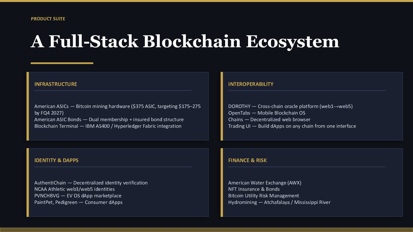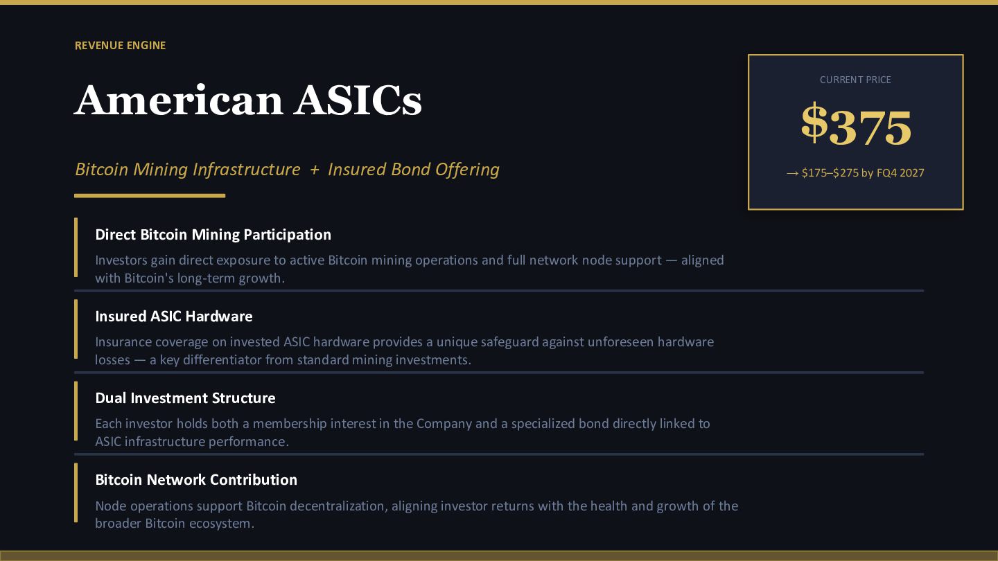 Offering CURRENT PRICE $375 → $175–$275 by FQ4 2027 Direct Bitcoin Mining Participation Investors gain direct exposure to active Bitcoin mining operations and full network node support — aligned with Bitcoin's long-term growth. Insured ASIC Hardware Insurance coverage on invested ASIC hardware provides a unique safeguard against unforeseen hardware losses — a key differentiator from standard mining investments. Dual Investment Structure Each investor holds both a membership interest in the Company and a specialized bond directly linked to ASIC infrastructure performance. Bitcoin Network Contribution Node operations support Bitcoin decentralization, aligning investor returns with the health and growth of the broader Bitcoin ecosystem.