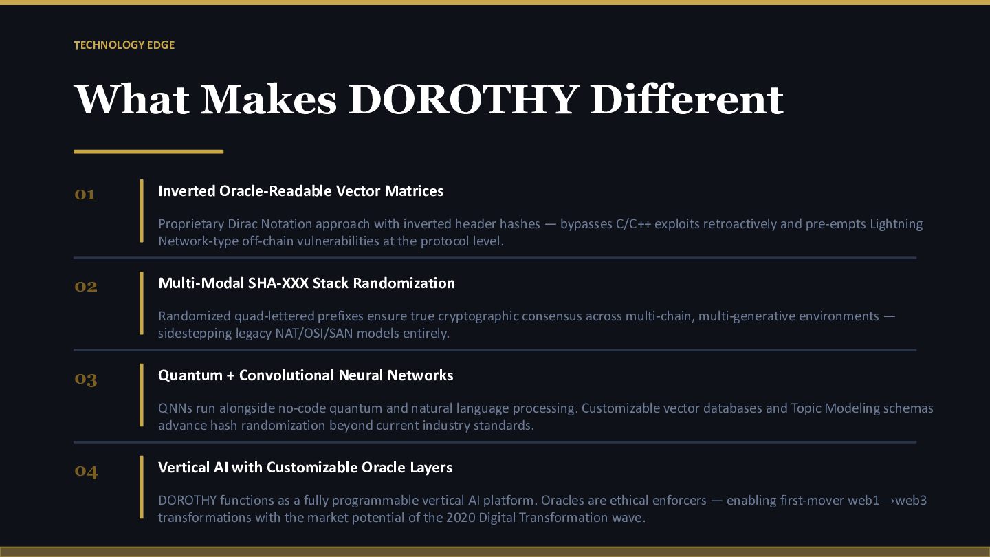 Matrices Proprietary Dirac Notation approach with inverted header hashes — bypasses C/C++ exploits retroactively and pre-empts Lightning Network-type off-chain vulnerabilities at the protocol level. 02 Multi-Modal SHA-XXX Stack Randomization Randomized quad-lettered prefixes ensure true cryptographic consensus across multi-chain, multi-generative environments — sidestepping legacy NAT/OSI/SAN models entirely. 03 Quantum + Convolutional Neural Networks QNNs run alongside no-code quantum and natural language processing. Customizable vector databases and Topic Modeling schemas advance hash randomization beyond current industry standards. 04 Vertical AI with Customizable Oracle Layers DOROTHY functions as a fully programmable vertical AI platform. Oracles are ethical enforcers — enabling first-mover web1→web3 transformations with the market potential of the 2020 Digital Transformation wave.