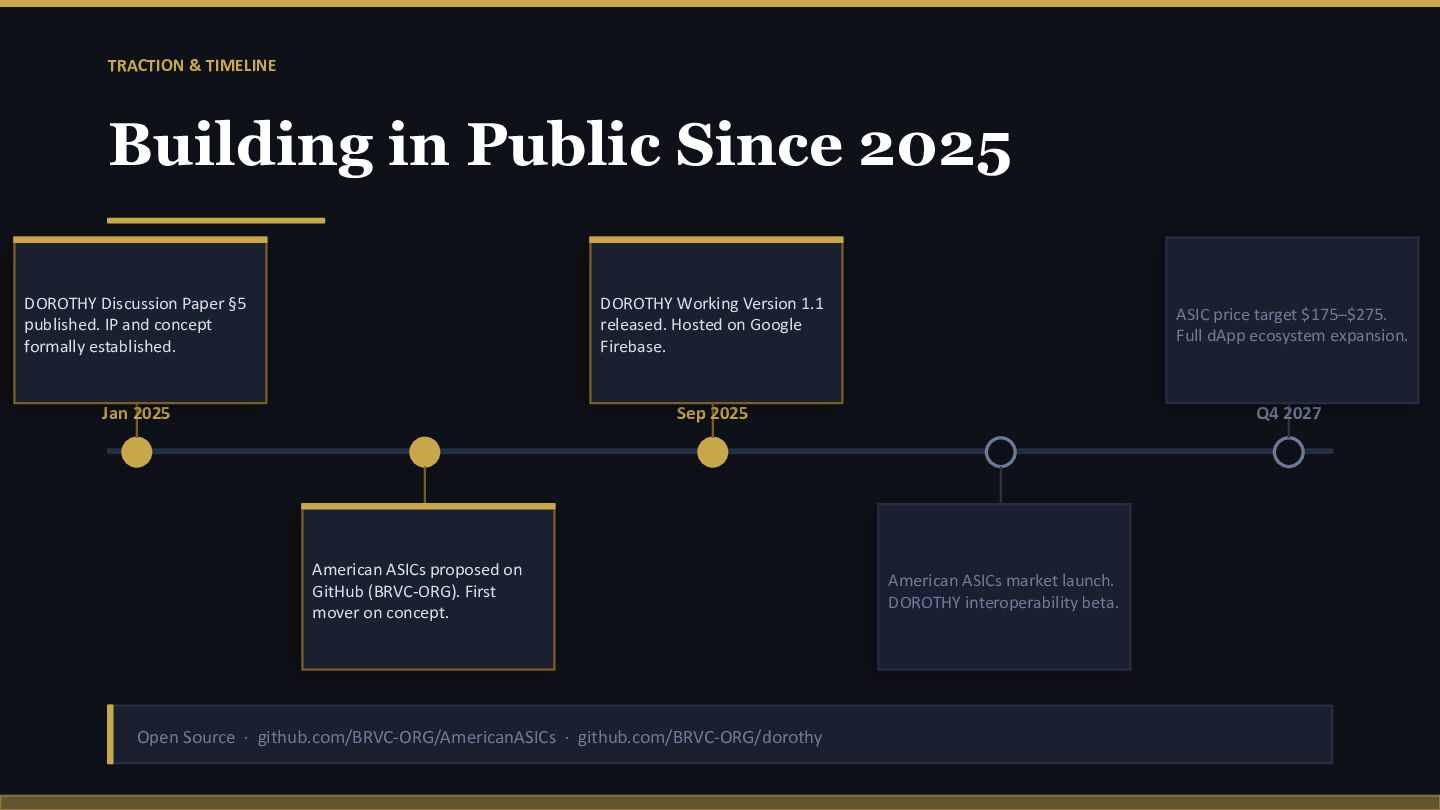 DOROTHY Discussion Paper §5 published. IP and concept formally established. Jul 2025 American ASICs proposed on GitHub (BRVC-ORG). First mover on concept. Sep 2025 DOROTHY Working Version 1.1 released. Hosted on Google Firebase. Q1 2026 American ASICs market launch. DOROTHY interoperability beta. Q4 2027 ASIC price target $175–$275. Full dApp ecosystem expansion. Open Source · github.com/BRVC-ORG/AmericanASICs · github.com/BRVC-ORG/dorothy