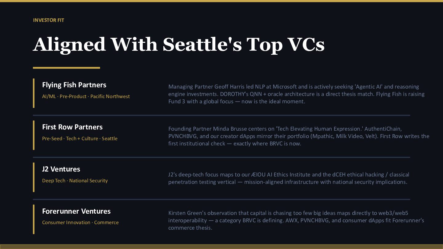 AI/ML · Pre-Product · Pacific Northwest Managing Partner Geoff Harris led NLP at Microsoft and is actively seeking 'Agentic AI' and reasoning engine investments. DOROTHY's QNN + oracle architecture is a direct thesis match. Flying Fish is raising Fund 3 with a global focus — now is the ideal moment. First Row Partners Pre-Seed · Tech + Culture · Seattle Founding Partner Minda Brusse centers on 'Tech Elevating Human Expression.' AuthentiChain, PVNCHBVG, and our creator dApps mirror their portfolio (Mpathic, Milk Video, Velt). First Row writes the first institutional check — exactly where BRVC is now. J2 Ventures Deep Tech · National Security J2's deep-tech focus maps to our ÆIOU AI Ethics Institute and the dCEH ethical hacking / classical penetration testing vertical — mission-aligned infrastructure with national security implications. Forerunner Ventures Consumer Innovation · Commerce Kirsten Green's observation that capital is chasing too few big ideas maps directly to web3/web5 interoperability — a category BRVC is defining. AWX, PVNCHBVG, and consumer dApps fit Forerunner's commerce thesis.