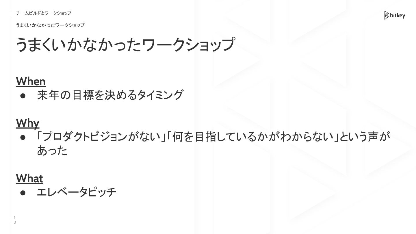 2. 1 3 チームビルドとワークショップ うまくいかなかったワークショップ うまくいかなかったワークショップ When • 来年の目標を決めるタイミング Why •