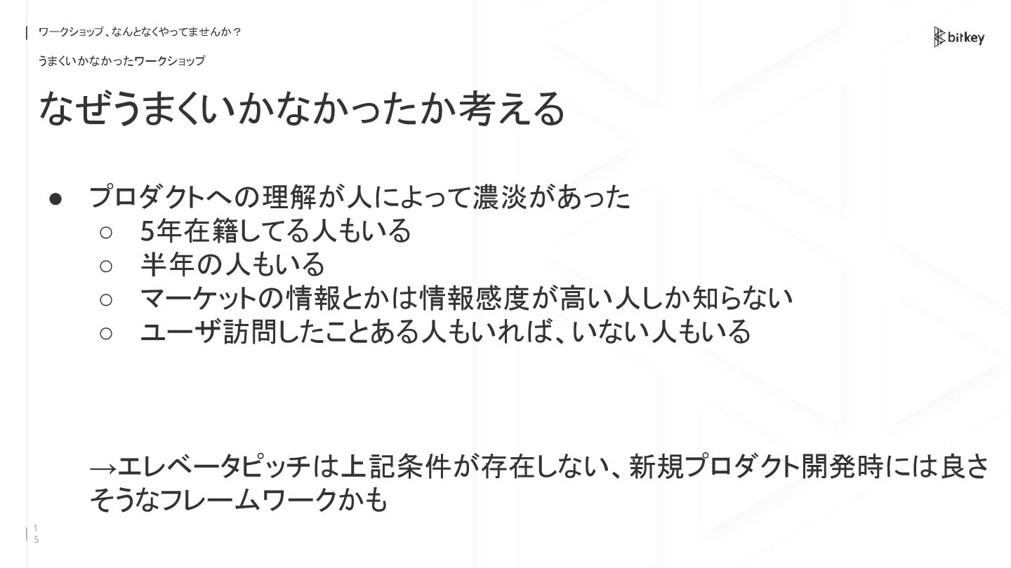 半年の人もいる ◦ マーケットの情報とかは情報感度が高い人しか知らない ◦ ユーザ訪問したことある人もいれば、いない人もいる →エレベータピッチは上記条件が存在しない、新規プロダクト開発時には良さ そうなフレームワークかも