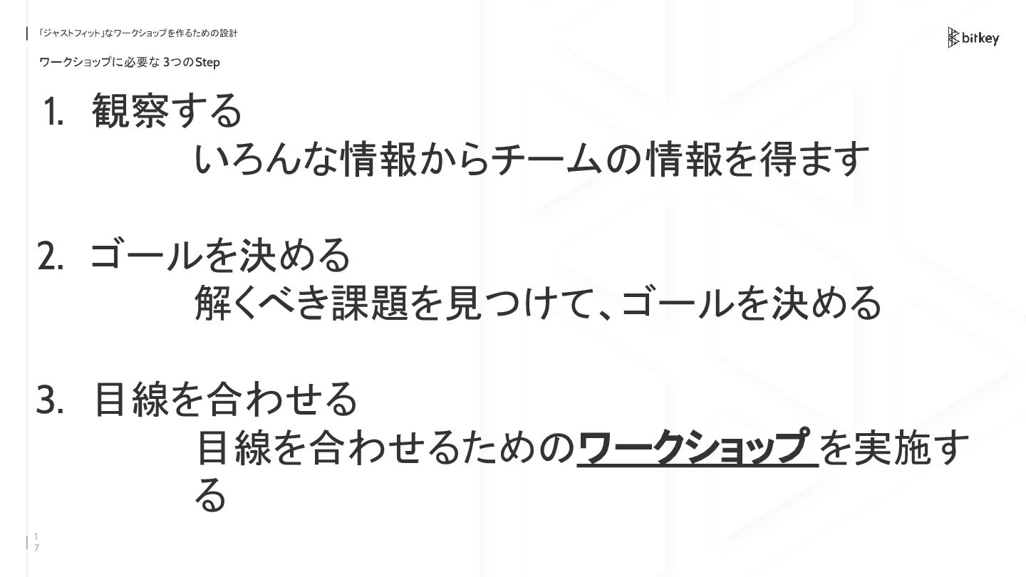 4. 1 7 「ジャストフィット」なワークショップを作るための設計 ワークショップに必要な 3つのStep 1. 観察する いろんな情報からチームの情報を得ます 2. ゴールを決める