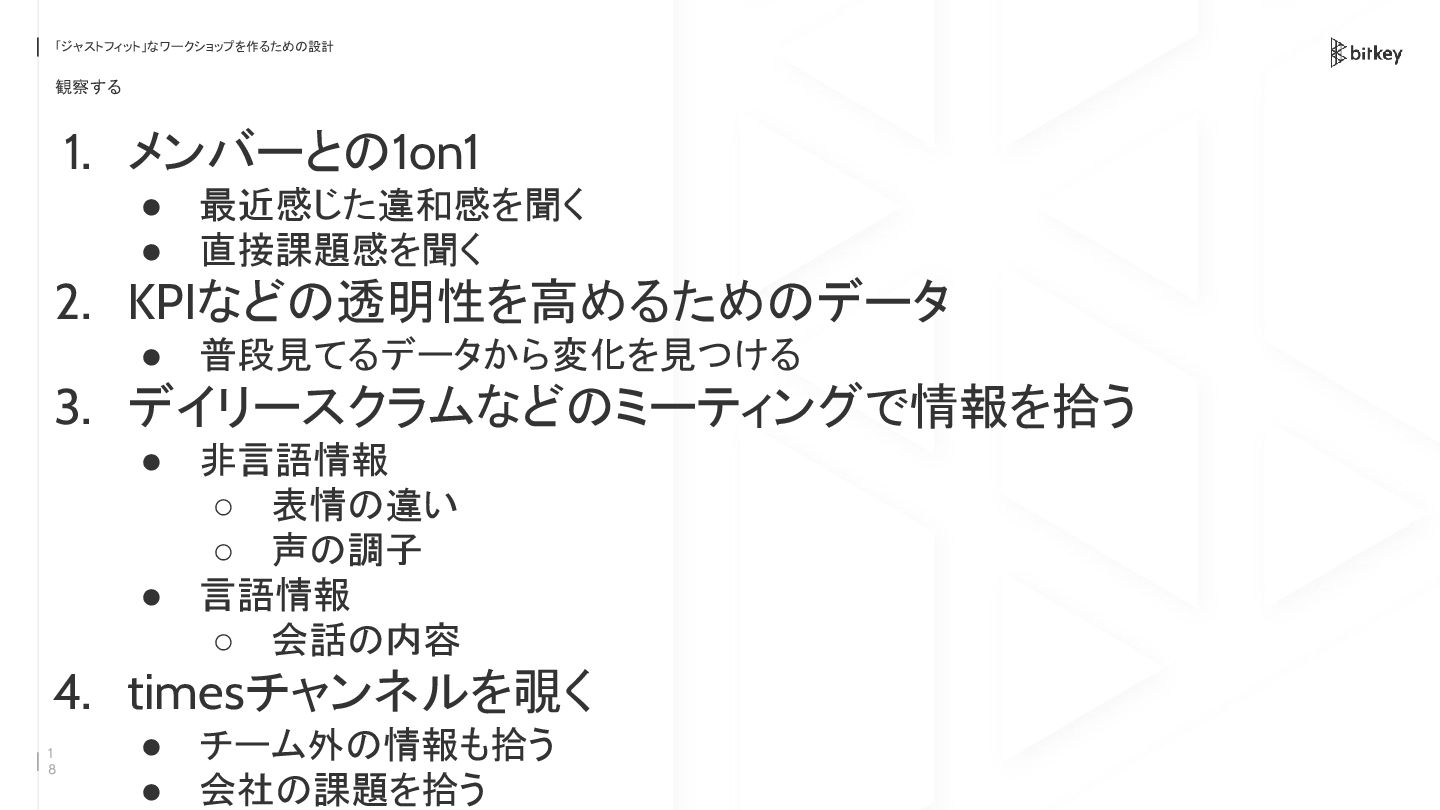 5. 1 8 「ジャストフィット」なワークショップを作るための設計 観察する 1. メンバーとの1on1 • 最近感じた違和感を聞く • 直接課題感を聞く